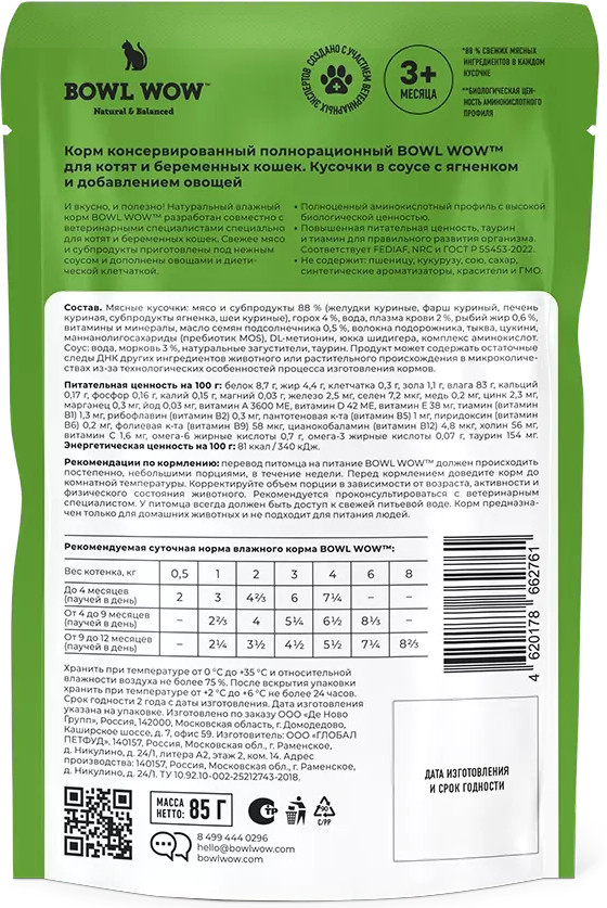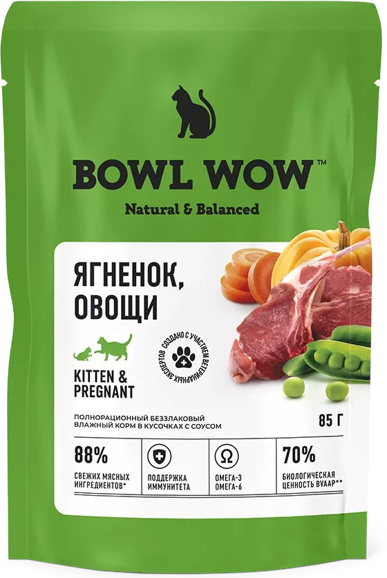 BOWL WOW Корм влажный для котят и беременных кошек с ягненком и овощами