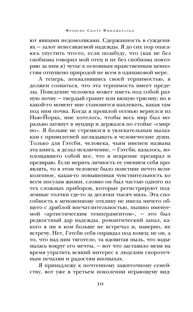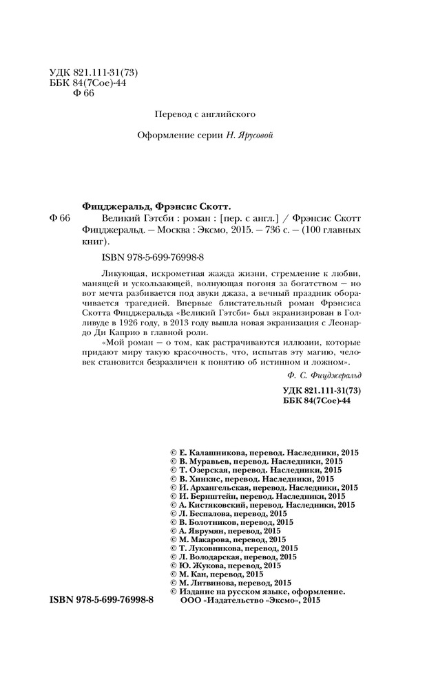 «Мой роман — о том, как растрачиваются иллюзии, которые придают миру такую красочность, что, испытав эту магию, человек становится безразличен к понятию об истинном и ложном». Ф.С. Фицджеральд.