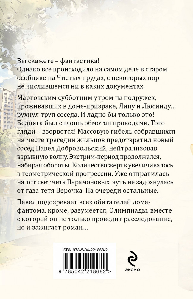 Серия: Столичный детектив. Новое оформление (обложка) Вы скажете — фантастика! Однако все происходило на самом деле в старом особняке на Чистых прудах, с некоторых пор не числившемся ни в каких документах. Мартовским субботним утром на подружек, проживавших в доме-призраке, Липу и Люсинду... рухнул труп соседа. И ладно бы только это! Бедняга был сплошь обмотан проводами. Того гляди — взорвется! Массовую гибель собравшихся на месте трагедии жильцов предотвратил новый сосед Павел Добровольский, нейтрализовав взрывную волну. Экстрим-период продолжался, набирая обороты. Количество жертв увеличивалось в геометрической прогрессии. Уже отправилась на тот свет чета Парамоновых, чуть не задохнулась от газа тетя Верочка. На очереди остальные. Павел подозревает всех обитателей дома-фантома, кроме, разумеется, Олимпиады, вместе с которой он не только проводит расследование, но и зажигает роман... |