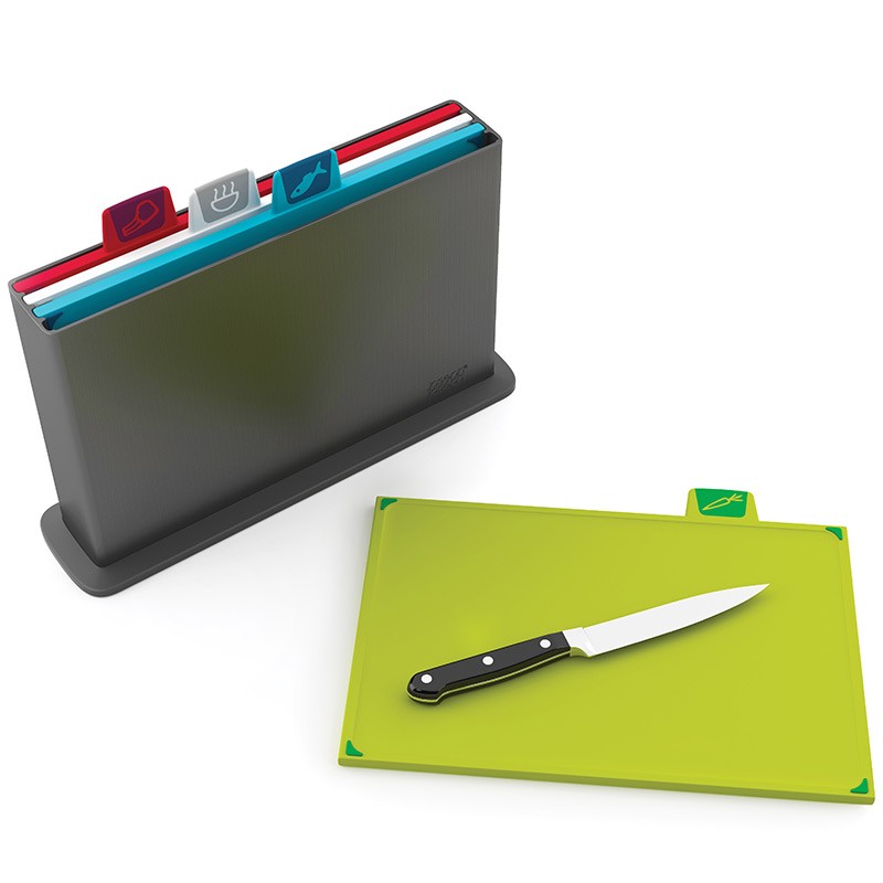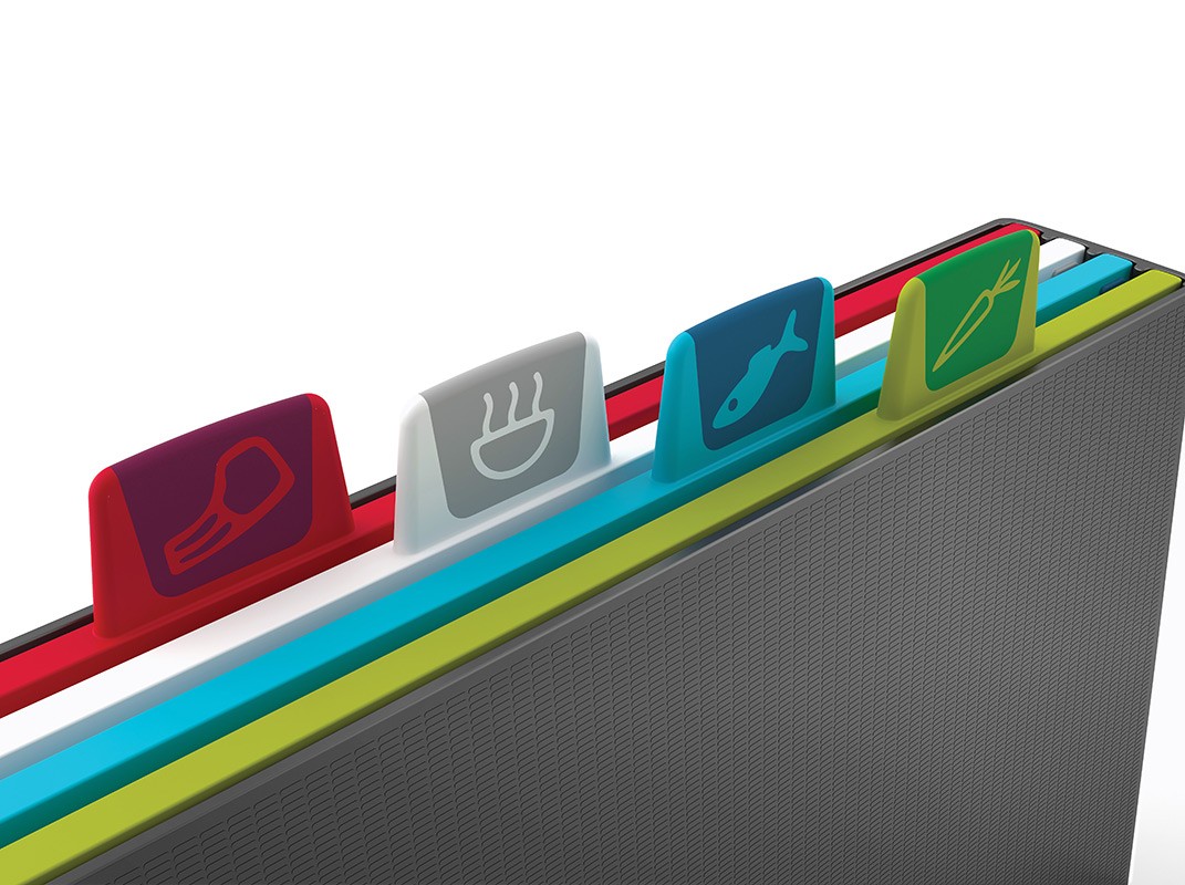 Инновационная новинка – набор разделочных досок «Index Chopping Board Set» – сэкономит время и поможет соблюсти все нормы гигиены. Четыре доски, идущие в комплекте, предназначены для мяса, рыбы и всяческих морепродуктов, овощей, выпечки. Цветовая классификация и специальные ярлычки, которые изображены на каждой утвари, позволяют сразу достать то, что необходимо.