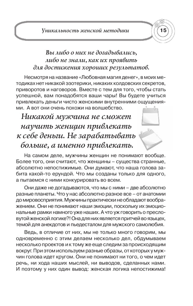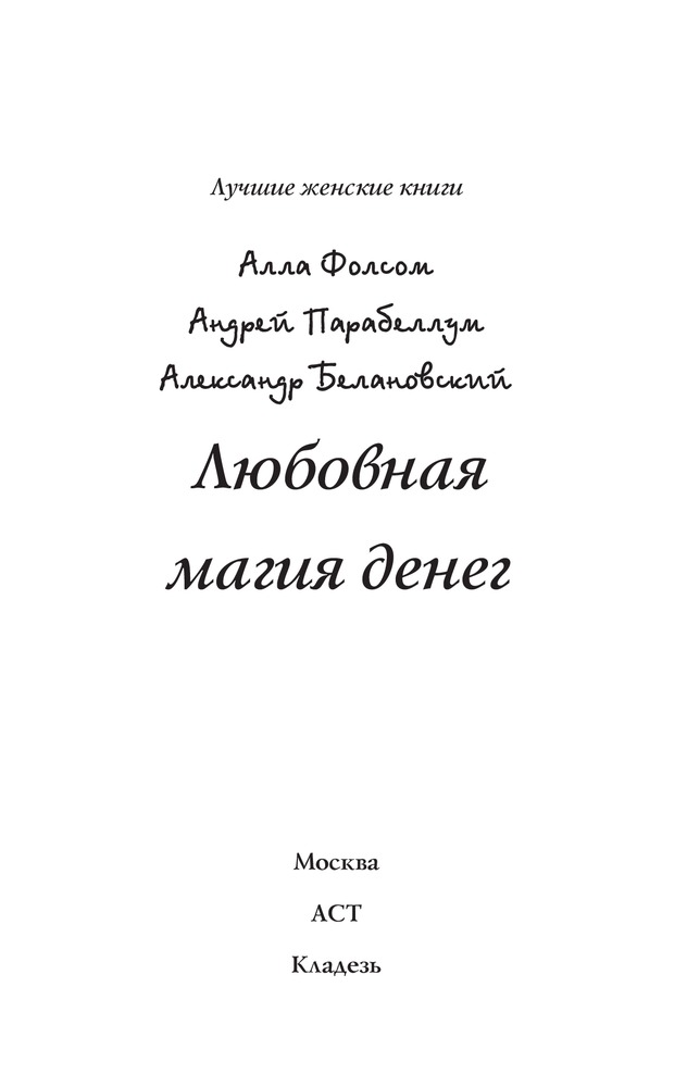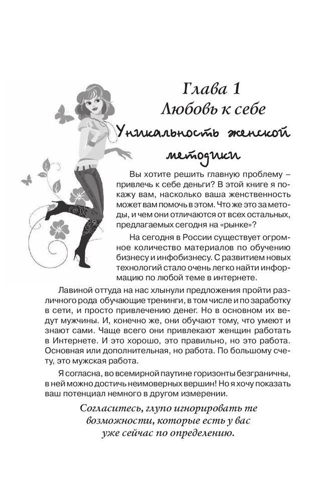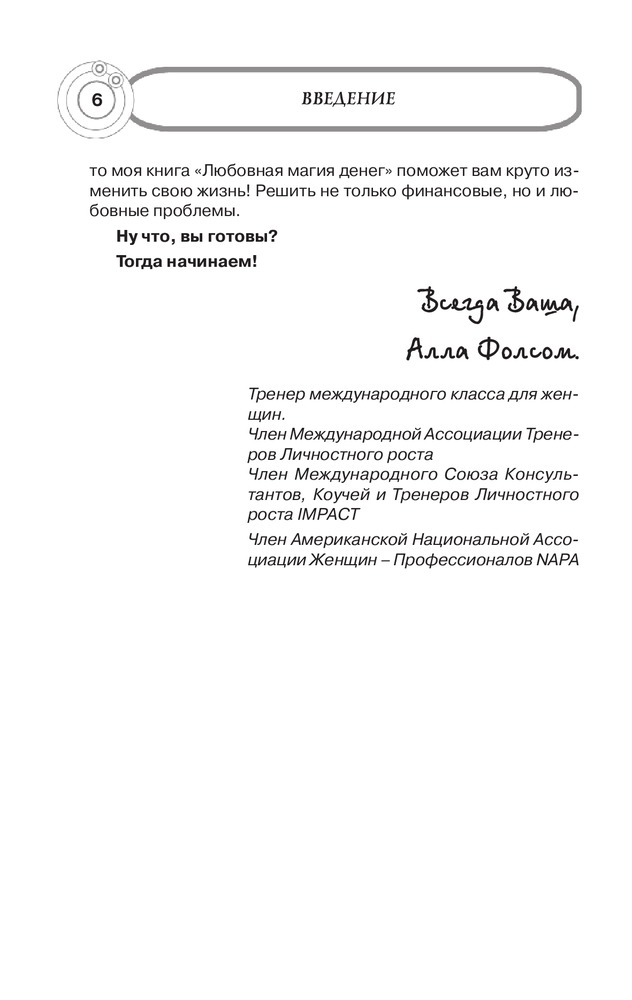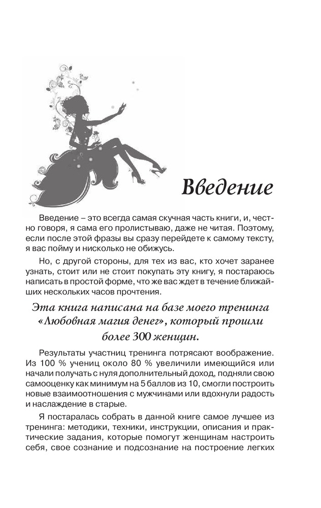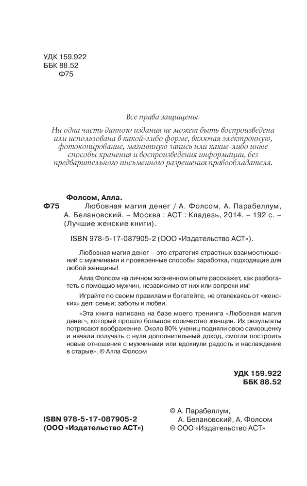 Любовная магия денегВ данный момент этот товар отсутствует в продаже. Возможно, у нас найдется аналогичный или похожий товар здесь. Серия: Лучшие женские книги Любовная магия денег – это стратегия страстных взаимоотношений с мужчинами и проверенные способы заработка, подходящие для любой женщины! Алла Фолсом, основываясь на личном жизненном опыте, расскажет, как разбогатеть с помощью мужчин, независимо от них или вопреки! Играй по своим правилам и богатей, не отвлекаясь от «женских» дел: семьи; заботы и любви. «Эта книга написана на базе моего тренинга «Любовная магия денег», который прошло большое количество женщин, результаты которых, потрясают воображение. Из 100% учениц около 80% подняли свою самооценку и начали получать с нуля дополнительный доход. Смогли построить новые взаимоотношения с мужчинами или вдохнули радость и наслаждение в старые». |