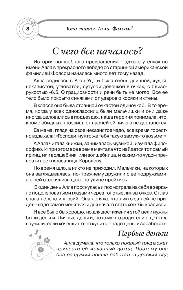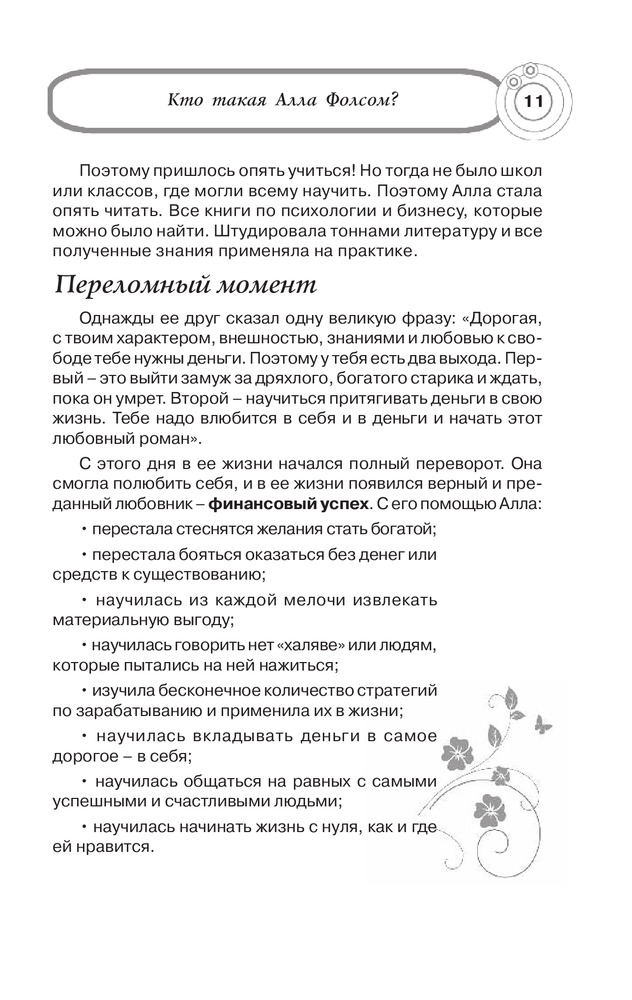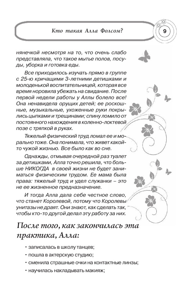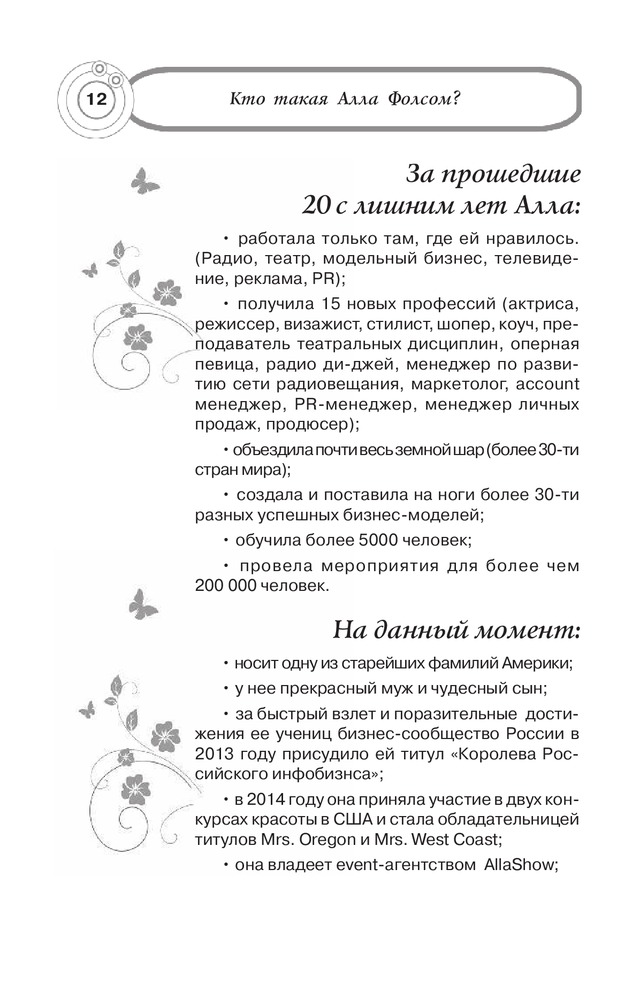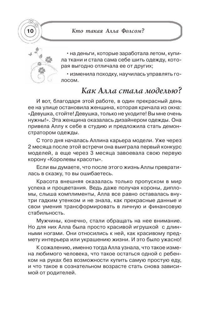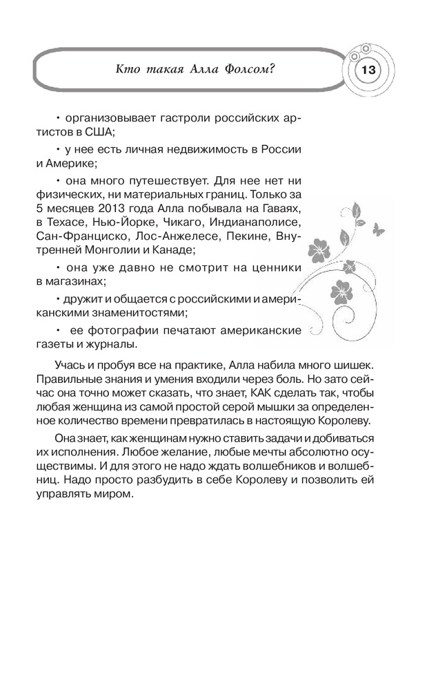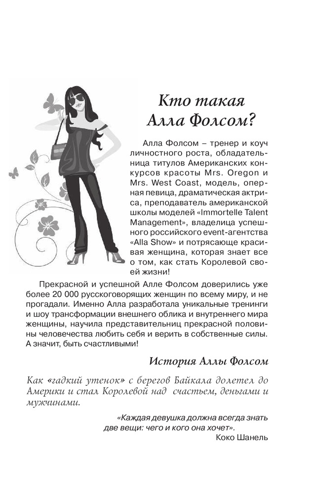 Очень благодарна сайту FLIP.KZ, за то что можно заказывать новинки книг, которые только вышли. Эту книгу хотела купить с момента анонса ее автором - Аллой Фолсом. Отличие книги в том, что это не просто очередное женское чтиво, а практическое пособие, основанное на опыте работы автора с конкретными, живыми женщинами. Книга читается на одном дыхании, написана живым языком. Помимо этого в книге даются практические упражнения, много четкой, структурированной информации, которую вроде бы и знал раньше, но почему-то в мозгу она не заняла подходящее ей место. И только с подачи автора, начинаешь действительно пользоваться этими советами. Также хочу отметить красивую обложку и удобный формат, я так думаю специально рассчитанный, чтобы ее можно было носить в женской сумочке, потому что книгу хочется перечитывать снова и снова. В общем, советую книгу всем девушкам, покупайте, не пожалеете, тем более за такую цену. И еще можете зайти на сайт Аллы Фолсом, там тоже много полезных советов.