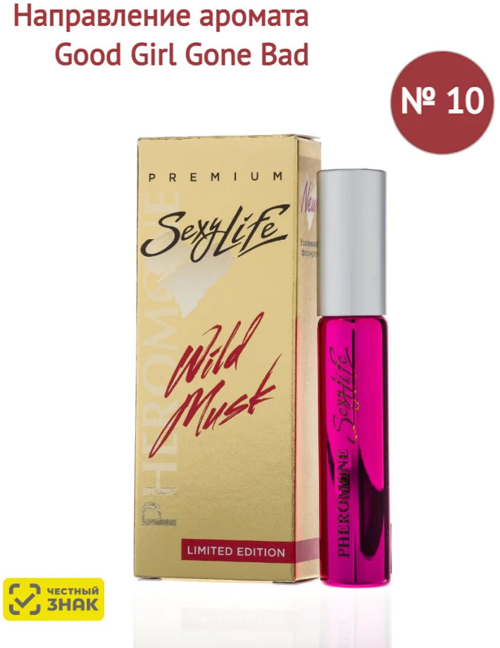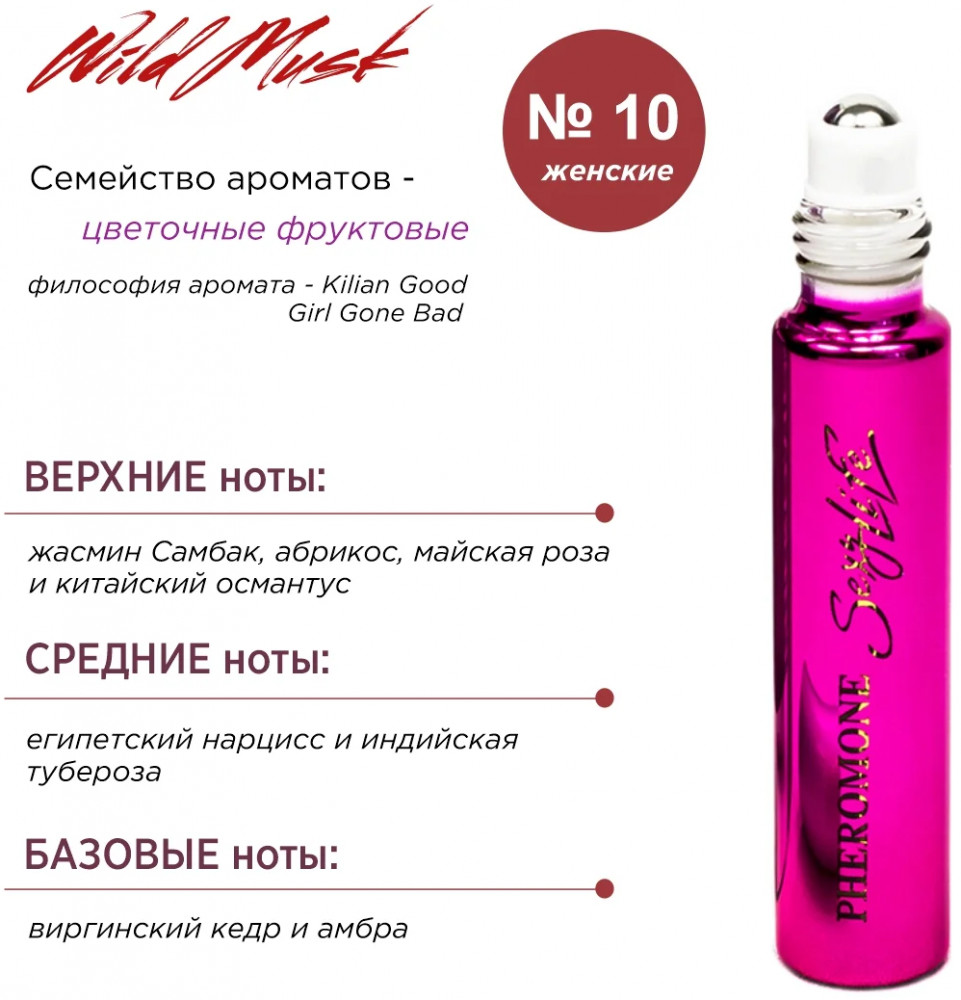 Духи масляные с феромонами марки Sexy Life «Wild Musk» № 10, женские. Для чувственных женщин, которые выглядят ангелами, но порой не прочь похулиганить. Семейство ароматов: цветочные, фруктовые. Верхние ноты: парфюмерная композиция начинается с нежных верхних нот жасмина Самбак, абрикоса, майской розы и китайского османтуса Сердце продолжается яркими нотками сердца египетского нарцисса и индийской туберозы База переходит в теплую базу, состоящую из ноток виргинского кедра и амбры. Бесспиртовые масляные духи женские с двойной дозой феромона и мускусом. Чувственный аромат становится магнитом для сильного пола. Молекулярный комплекс Iso Super гарантирует стойкость. Флакон 10 мл с шариковым дозатором легко брать с собой. Sexy Life — духи с феромонами с 20-летней историей.