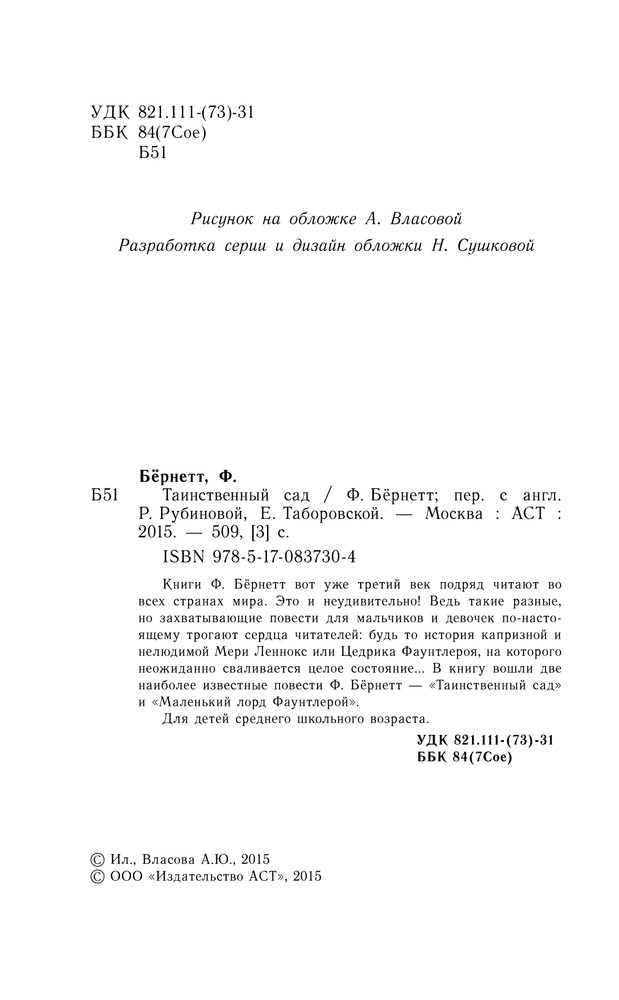 Заказывала книгу "Таинственный сад" и была приятно удивлена, найдя в ней ещё и повесть "Маленький лорд Фаунтлерой". Очень интересные и добрые произведения как для детей, так и для их мам. Обложка не мягкая, а из двойного картона. Книга толстая, листы серые газетные, но для меня это не имеет значения. Очень довольны.