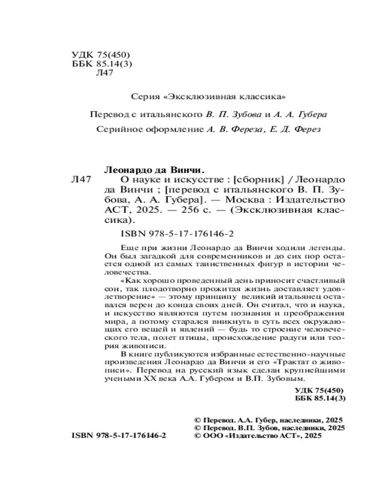 Серия: Эксклюзивная классика (Лучшее) Еще при жизни Леонардо да Винчи ходили легенды. Он был загадкой для современников и до сих пор остается одной из самых таинственных фигур в истории человечества. «Как хорошо проведенный день приносит счастливый сон, так плодотворно прожитая жизнь доставляет удовлетворение» — этому принципу великий итальянец оставался верен до конца своих дней. Он считал, что и наука, и искусство являются путем познания и преображения мира, а потому старался вникнуть в суть всех окружающих его вещей и явлений — будь то строение человеческого тела, полет птицы, происхождение радуги или теория живописи. |