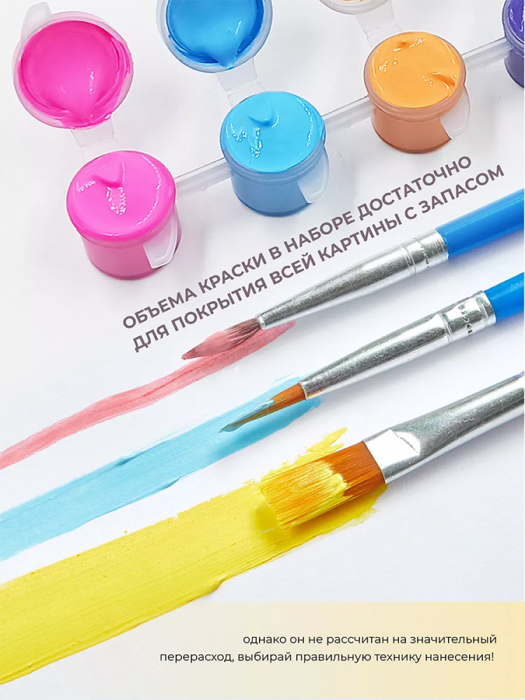 В комплект входят акриловые краски, отличающиеся яркостью и стойкостью. Они быстро сохнут, обеспечивают плотное покрытие и позволяют добиться насыщенных оттенков. Акриловые краски безопасны, так как не содержат токсичных веществ. Три вида кистей позволят проработать как крупные участки изображения, так и мелкие детали, требующие особой аккуратности. Чтобы ваша работа служила долго и радовала глаз, покройте ее финишным лаком, который защитит готовую картину от пыли и других внешних воздействий. Создание картины по номерам станет увлекательным семейным досугом, развивающим творческие способности.