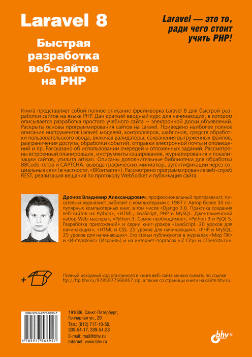 Серия: Профессиональное программирование Книга представляет собой полное описание фреймворка Laravel 8 для быстрой разработки сайтов на языке PHP. Дан краткий вводный курс для начинающих, в котором описывается разработка простого учебного сайта — электронной доски объявлений. Раскрыты основы программирования сайтов на Laravel. Приведено наиболее полное описание инструментов Laravel: моделей, контроллеров, шаблонов, средств обработки пользовательского ввода, включая валидаторы, сохранения выгруженных файлов, разграничения доступа, обработки событий, отправки электронной почты и пр. Рассказано об использовании очередей и отложенных заданий. Рассмотрены встроенный планировщик, инструменты кэширования, журналирования и локализации сайтов, утилита artisan. Описаны дополнительные библиотеки для обработки BBCode-тегов и CAPTCHA, вывода графических миниатюр, аутентификации через социальные сети (в частности, «ВКонтакте»). Рассмотрено программирование веб-служб REST, реализация вещания по протоколу WebSocket и публикация сайта. Электронный архив на сайте издательства содержит исходный код описанного в книге сайта. |