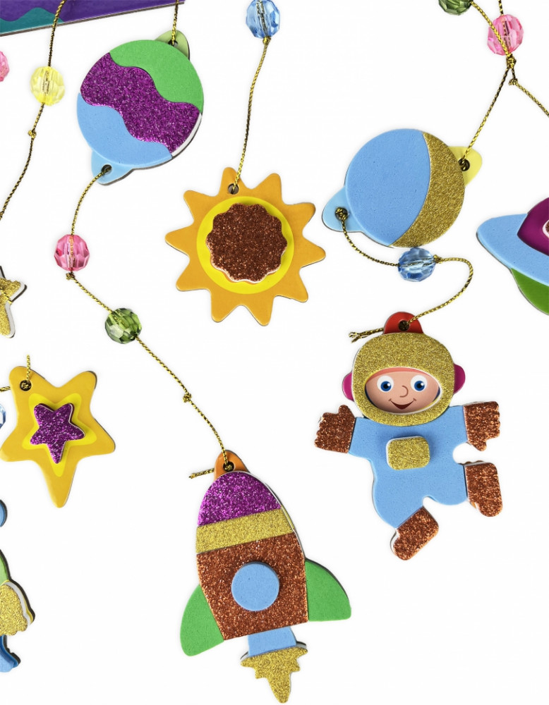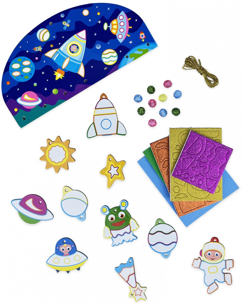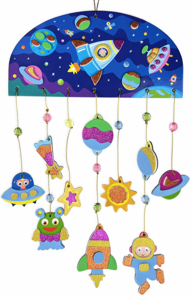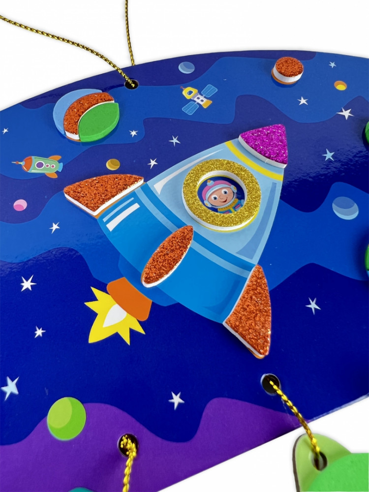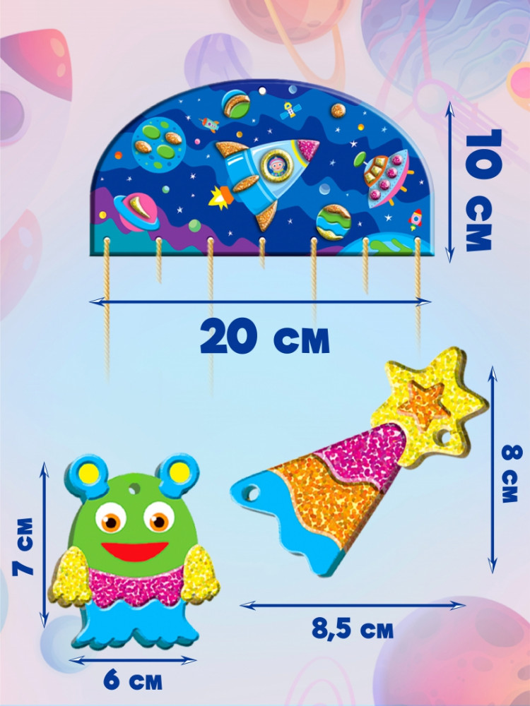 Серия: Мягкая картинка Аппликация-подвеска — это оригинальная и яркая поделка для детей без клея и ножниц. В наборе для творчества есть все необходимое — подвеска; фигурки космических объектов из картона; детали из мягкого пластика для декора; бусины для рукоделия и шнурок. Детали для украшения поделки выполнены из современного объёмного полимерного материала ЭВА — безопасного, экологически чистого, не вызывающего аллергии, простого в использовании и приятного на ощупь. Все детали аппликации уже вырезаны и готовы к работе. Нужно лишь снять с защитного слоя фрагмент и приклеить его в соответствующее место с одной стороны фигурки (на белые участки). После того как фигурки будут готовы, подвесьте их к держателю. Украсьте нити декоративными бусинами и мобиль готов. Игрушка, сделанная своими руками, станем любимым украшением для детской комнаты или оригинальным подарком родным и близким. |