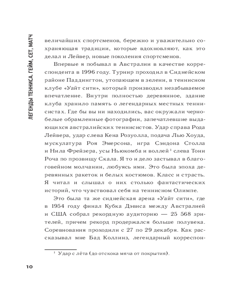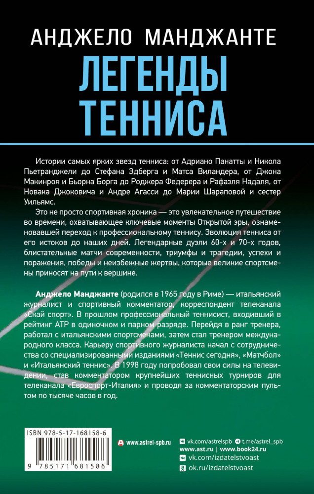 Серия: Звезды спорта Истории самых ярких звезд тенниса: от Адриано Панатты и Никола Пьетранджели до Стефана Эдберга и Матса Виландера, от Джона Макинроя и Бьорна Борга до Роджера Федерера и Рафаэля Надаля, от Новака Джоковича и Андре Агасси до Марии Шараповой и сестер Уильямс. |