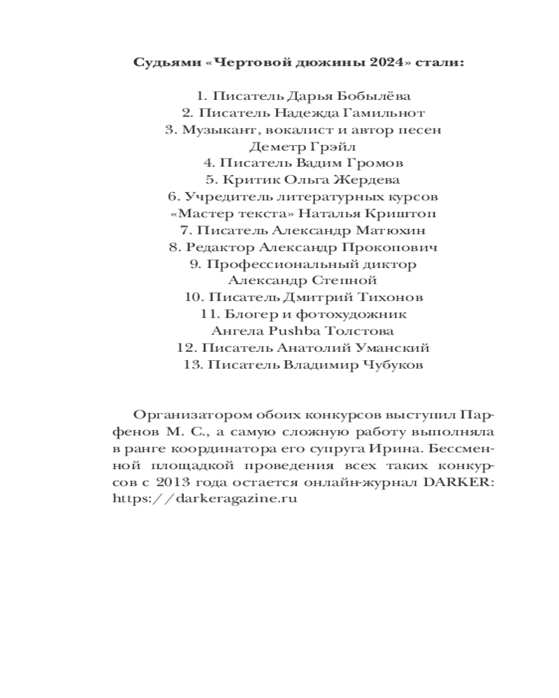 Серия: Самая страшная книга Спросите — с чего начинался практически ВЕСЬ современный русский хоррор? Ответ — DARKER. Онлайн-журнал, выпускающийся каждый месяц с 2011 года и по сей день. Российский фэнзин, отмеченный наградами крупнейшего мирового фестиваля «Еврокон» и премии «Мастера ужасов». Спросите — с чего начинали практически ВСЕ мало-мальски известные авторы современного русского хоррора? Ответ — «Чертова дюжина». По-настоящему культовый конкурс страшных рассказов, один из старейших, самых престижных и самых уважаемых в Рунете. |