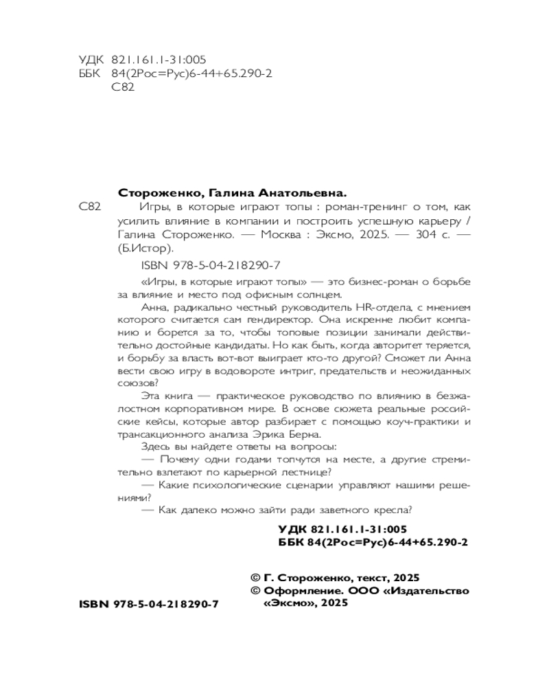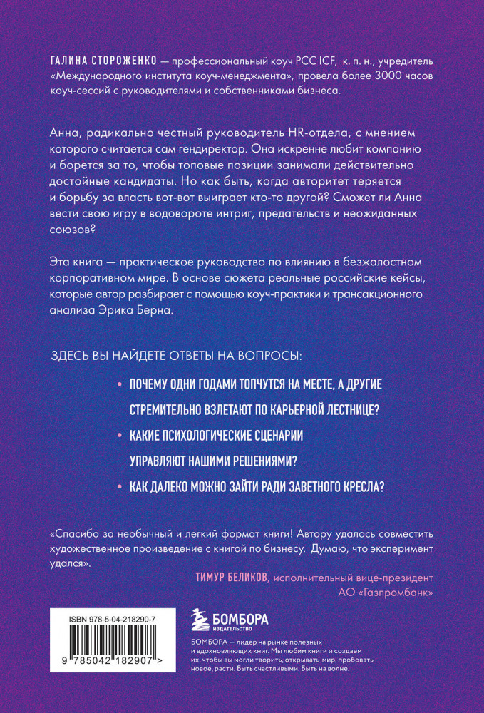 Серия: Бизнес-истории «Игры, в которые играют топы» — это бизнес-роман о борьбе за влияние и место под офисным солнцем. Анна — радикально честный руководитель HR-отдела, с мнением которого считается сам гендиректор. Она искренне любит компанию и борется за то, чтобы топовые позиции занимали действительно достойные кандидаты. Но как быть, когда авторитет теряется и борьбу за власть вот-вот выиграет кто-то другой? Сможет ли Анна вести свою игру в водовороте интриг, предательств и неожиданных союзов? |