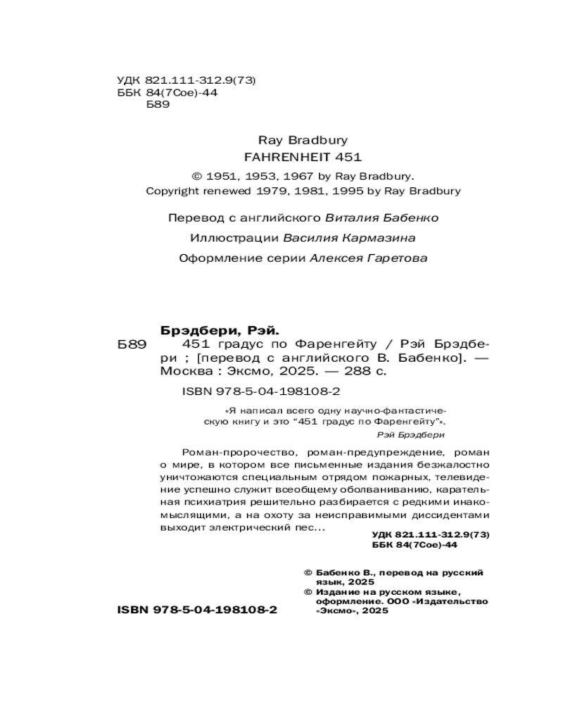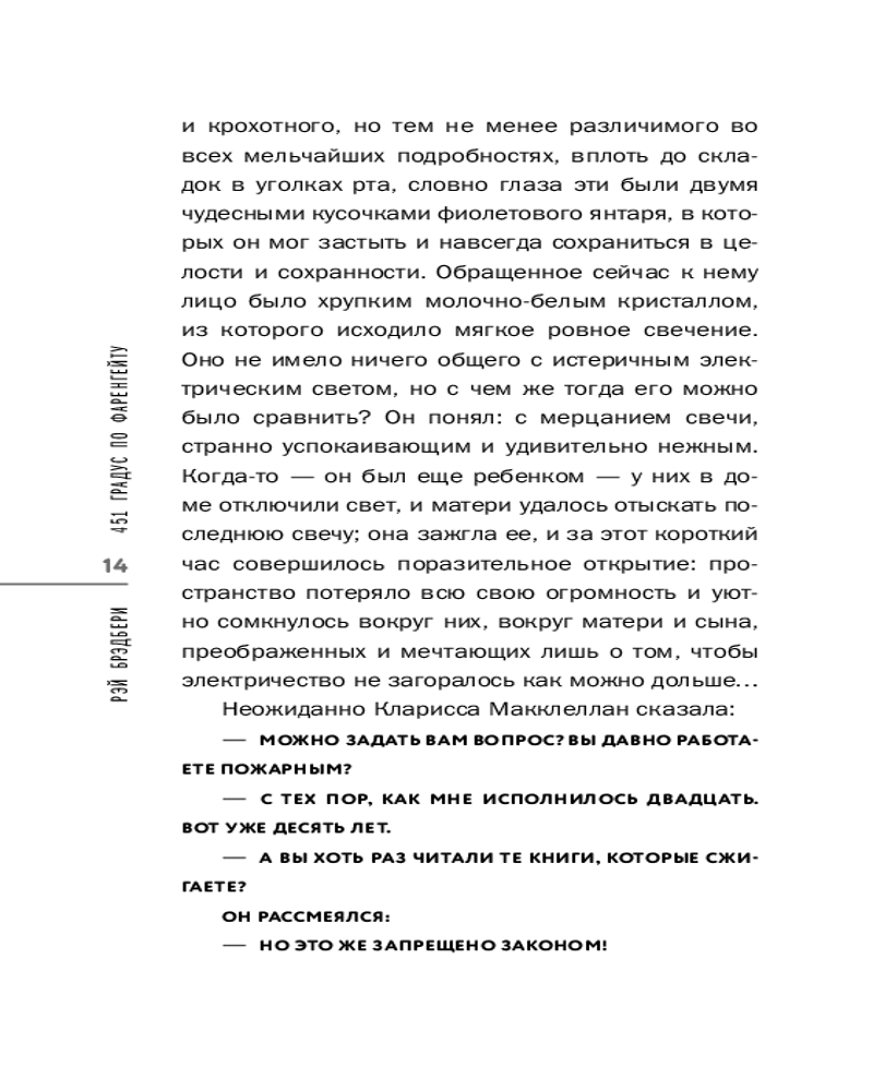 Серия: Яркие страницы. Коллекция Р. Брэдбери Философская антиутопия Рэя Брэдбери рисует беспросветную картину развития постиндустриального общества. Роман, принесший своему творцу мировую известность. Сенсационным было заявление Брэдбери в 2007 году, что «451 градус по Фаренгейту» понимают неправильно. Эта книга не о правительственной цензуре, это история о том, как телевидение уничтожает интерес к чтению книг. |