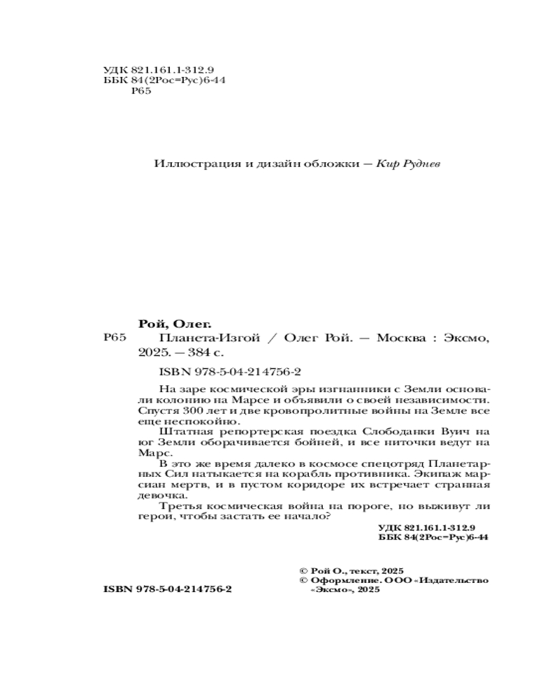 💳 Оплатить за товар можно при получении 🇰🇿 Есть бесплатная доставка по Казахстану 🎁 Копите бонусы с каждой покупки Серия: Изгои Олега Роя На заре космической эры изгнанники с Земли основали колонию на Марсе и объявили о своей независимости. Спустя 300 лет и две кровопролитные войны на Земле всё ещё неспокойно. Штатная репортёрская поездка Слободанки Вуич на юг Земли оборачивается бойней, и все ниточки ведут на Марс. В это же время далеко в космосе спецотряд Планетарных Сил натыкается на корабль противника. Экипаж марсиан мёртв, и в пустом коридоре их встречает странная девочка. Третья космическая война на пороге, но выживут ли герои, чтобы застать её начало? |