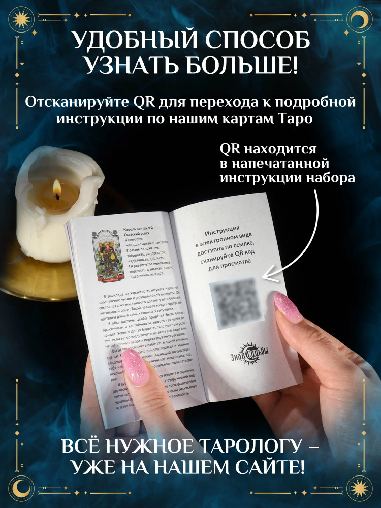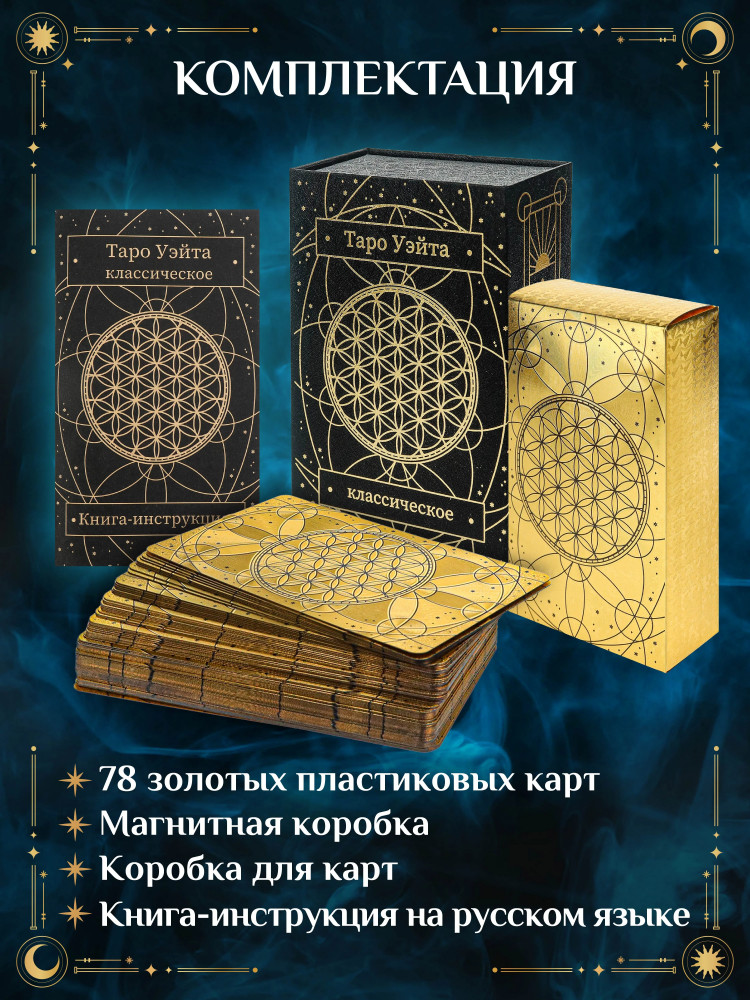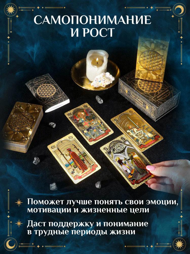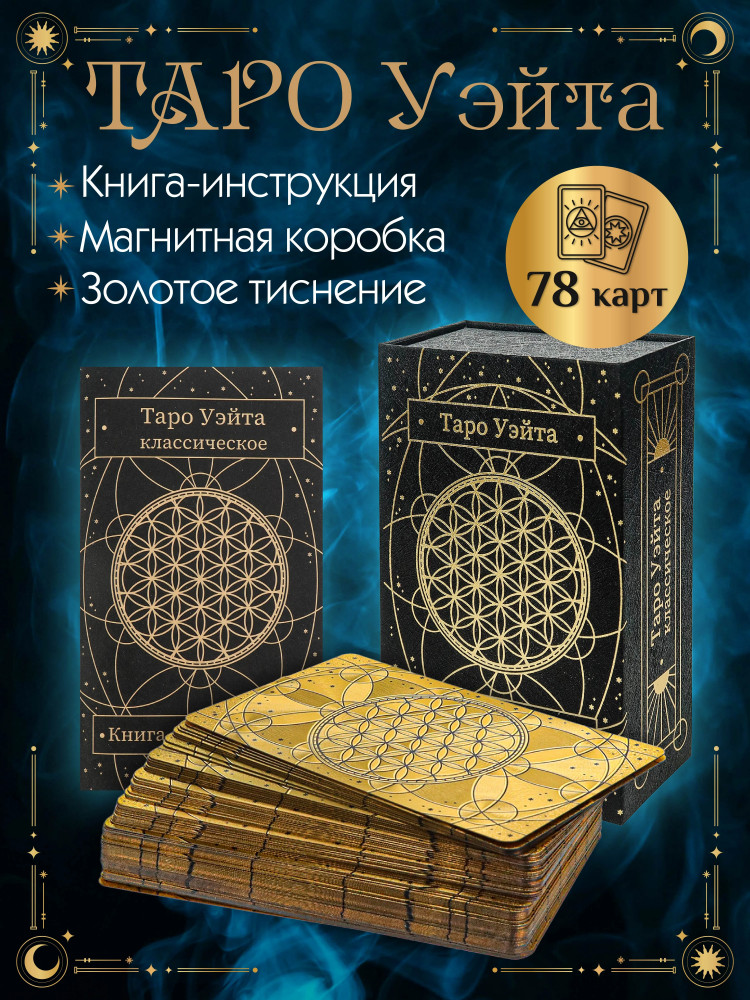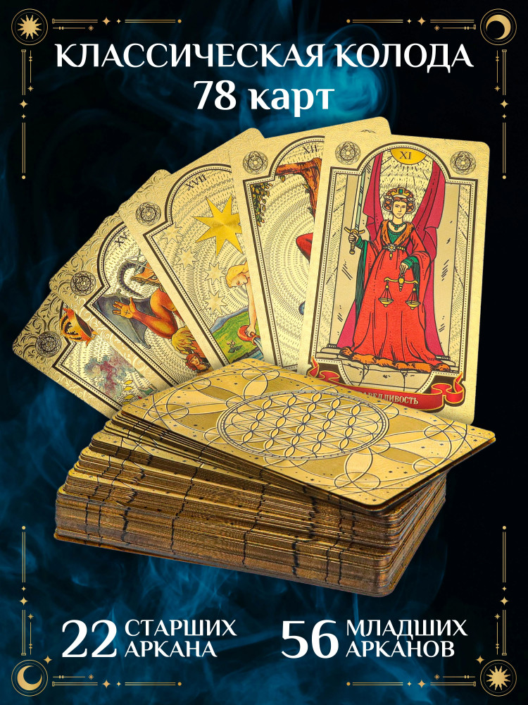 Карты Таро выступают важным инструментом для тех, кто интересуется мистикой и самопознанием. Возникнув много веков назад, они продолжают привлекать внимание и в наше время. Эта колода состоит из 78 карт. Это обеспечивает долговечность использования и приятные тактильные ощущения при работе с ними. Прочная структура гарантирует сохранность изображений даже при частом использовании. Карты легко смешиваются и разделяются по группам, позволяя комфортно проводить гадания или изучать их символику. Яркий дизайн карты гармонично сочетает в себе классические элементы традиционного таро Уэйта с современными стилистическими решениями. Эстетика каждой карты отличается насыщенностью и выразительностью, что способствует глубокому погружению в мир символики и делает чтение более увлекательным и значимым процессом. Золотистое тиснение добавляет колоде особой изысканности и привлекательности, делая её стильной деталью любой коллекции или интерьера. Эти элементы играют не только декоративную роль — они также работают на создание уникальной атмосферы во время сеанса гадания или медитации. |