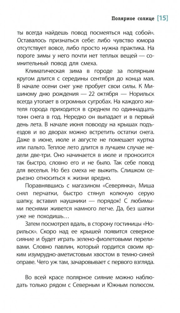 Серия: Лауреаты Международного конкурса имени Сергея Михалкова В самом северном городе мира Норильске климат суров. И жизнь не делает поблажек, даже если ты еще вроде бы ребенок. Мише не исполнилось и четырнадцати лет, но обстоятельства складываются так, что ему самому приходится думать о заработке, еде, теплой одежде. Как же, оказывается, раньше все было легко и просто! А теперь даже не у кого попросить помощи, и так тяжело делать вид, что у тебя по-прежнему всё в порядке. Для среднего и старшего школьного возраста. |