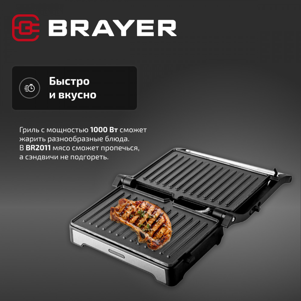 Устройство защищено от поражения электротоком и перегрева, что обеспечивает безопасность его использования. Электрический гриль-пресс Brayer BR2011 — это многофункциональное устройство, которое поможет вам приготовить разнообразные и вкусные блюда, при этом сэкономив время и силы.