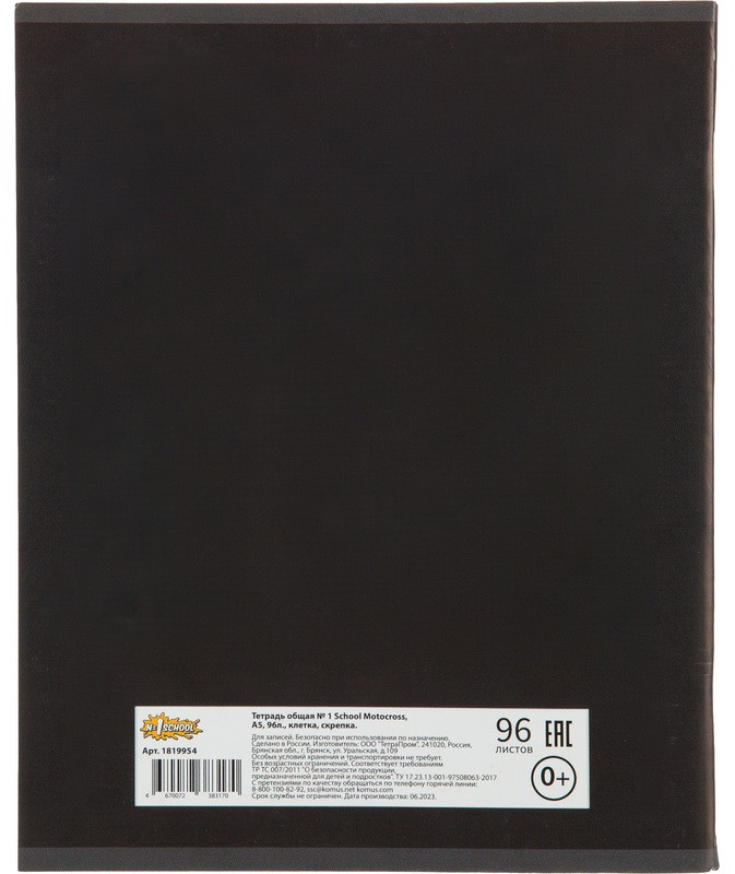 Тетрадь школьная формата А5. Обложка из импортного картона плотностью 190 г/м2. В блоке 96 листов в клетку с полями. Бумага офсетная плотностью 60 г/м2. Цвет линовки — синий. Тип скрепления — скоба. |