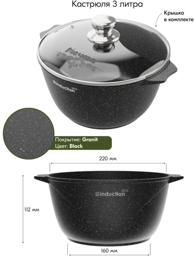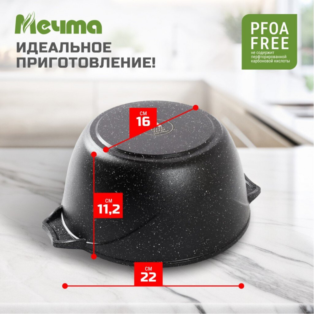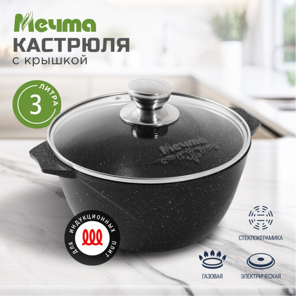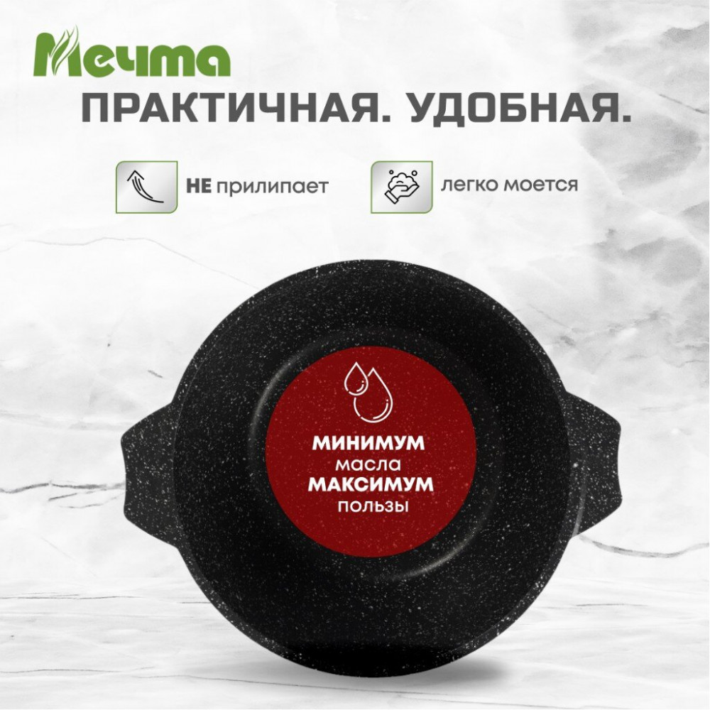 Кастрюля индукционная АП Гранит black Induction Pro из литого толстостенного алюминия Мечта станет незаменимым инструментом и надежным помощником на вашей кухне. Многофункциональная глубокая кастрюля отлично подойдет для приготовления разнообразных блюд из мяса, рыбы и овощей. Благодаря термоаккумулирующим свойствам пищевого алюминия пища не пригорает, а томится, благодаря новейшей формуле сверхпрочного антипригарного покрытия готовить можно при минимальном количестве масла не переживая за то что пища может пригореть. На посуде ТМ Мечта можно жарить, тушить и варить без потерь вкусовых и полезных качеств продуктов.