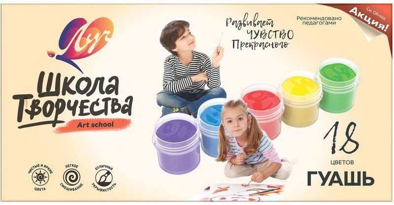 Серия: Школа творчества Гуашь Луч Школа творчества изготовлена по улучшенной рецептуре. Яркие и красивые цвета красок стали максимально подготовлены для быстрого рисования. Благодаря меньшему расходованию белил из набора, цвета красок теперь будут заканчиваться равномерно, что позволит использовать набор более рационально. В наборе 18 цветов. Объем 1 банки 20 мл. Набор упакован в картонную коробку. |