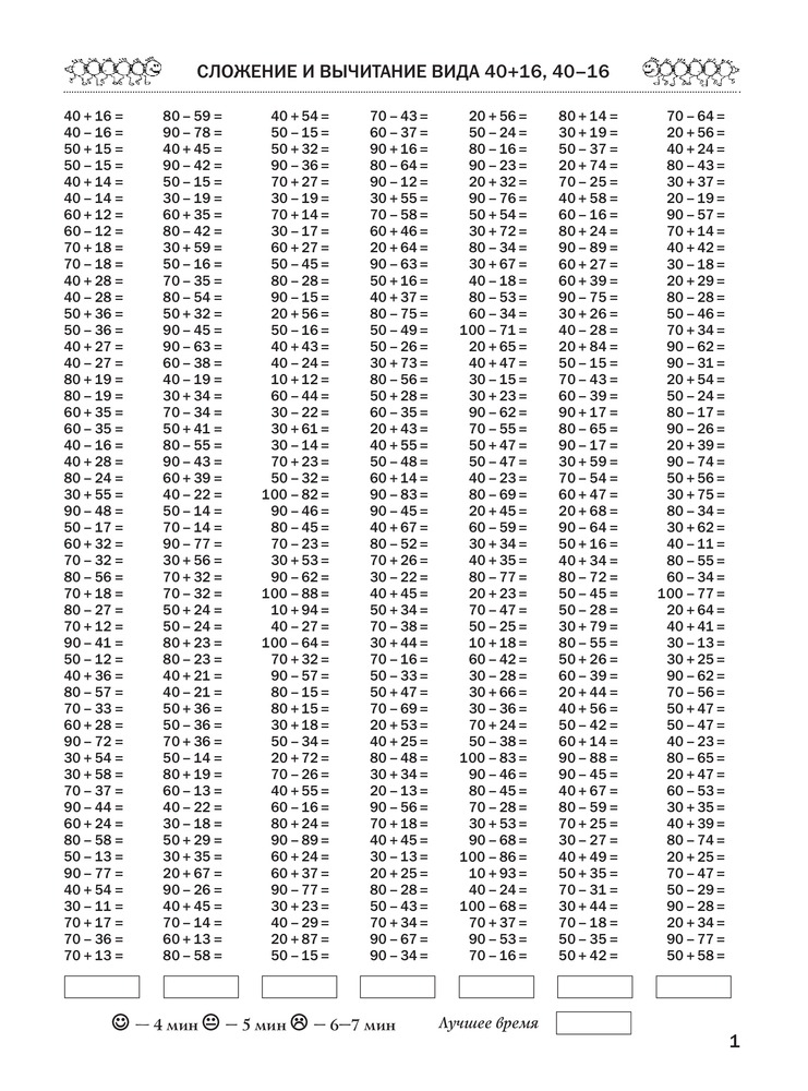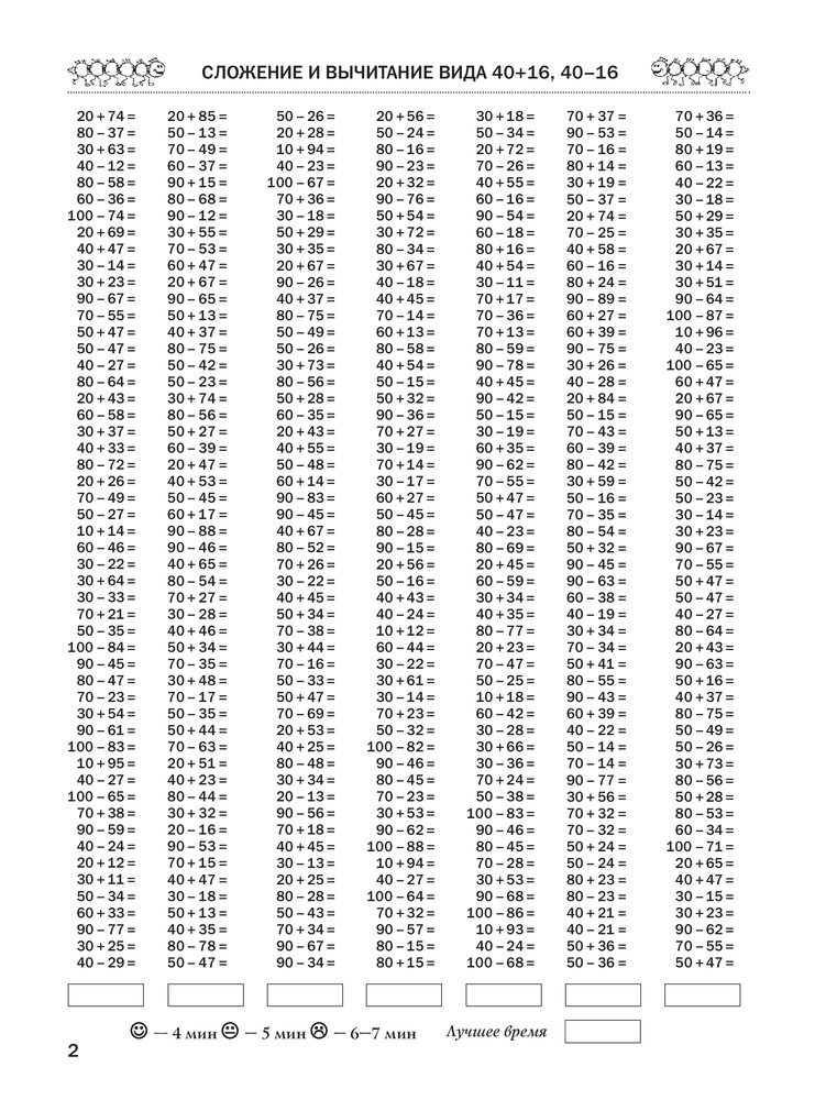 Данное пособие содержит 3000 примеров на сложение и вычитание в пределах сотни. Тема "СОТНЯ" - одна из базовых тем для второго полугодия второго класса системы 1-4 и второго полугодия первого класса системы 1-3. Как и любая другая тема, изучаемая ребенком в этом возрасте, она требует внимательного осмысления ихорошего закрепления.