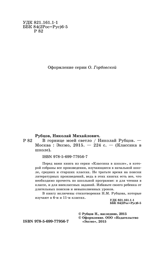 В данный момент этот товар отсутствует в продаже. Возможно, у нас найдется аналогичный или похожий товар здесь. Серия: Классика в школе Перед Вами книга из серии «Классика в школе», в которую собраны все произведения, изучающиеся в начальной школе, средних и старших классах. Не тратьте время на поиски литературных произведений, ведь в этих книгах есть все, что необходимо прочесть по школьной программе: и для чтения в классе, и внеклассных заданий. Избавьте своего ребенка от длительных поисков и невыполненных уроков. В книгу включены стихотворения Н.М. Рубцова, которые изучают в 6 и 11 классах. |