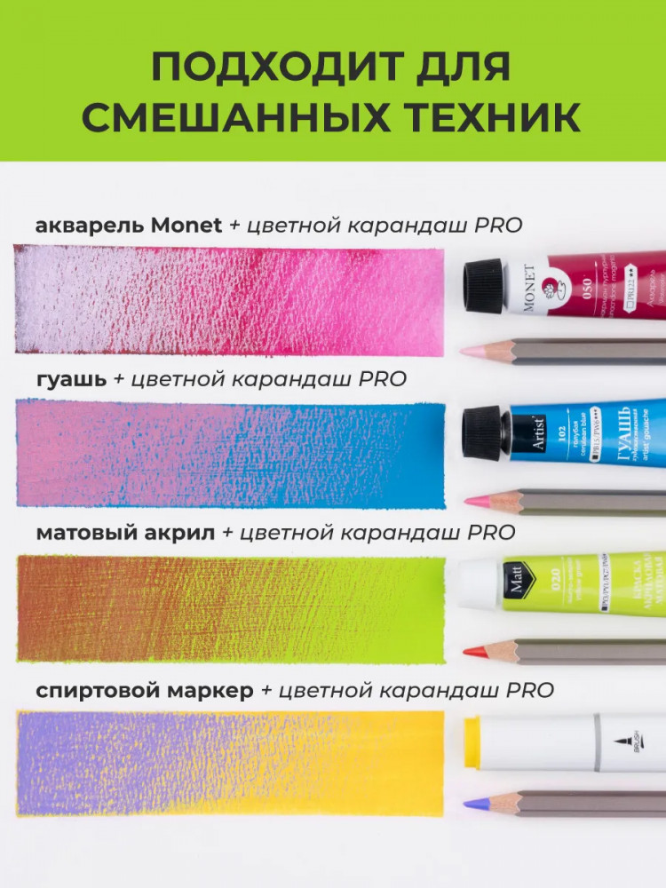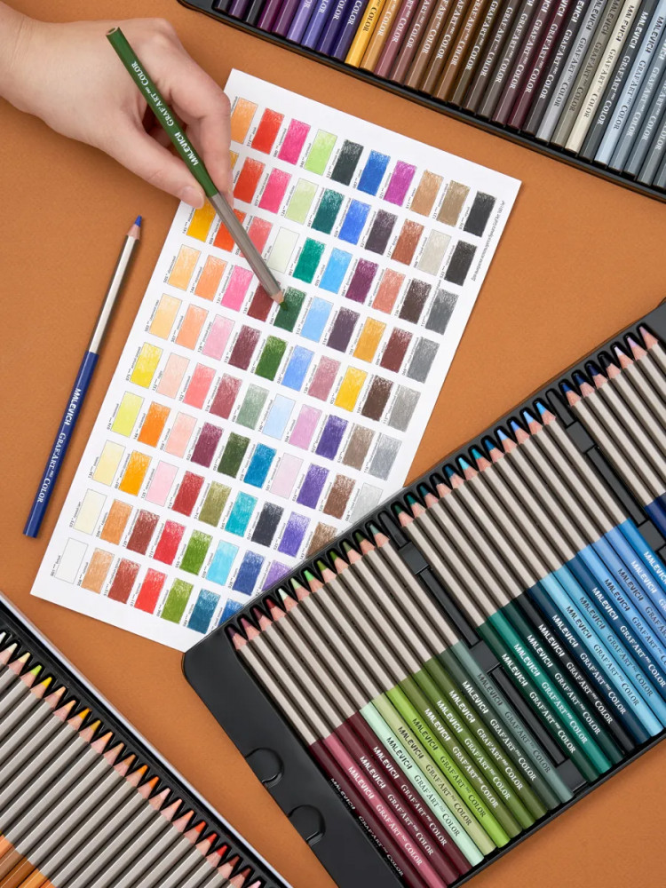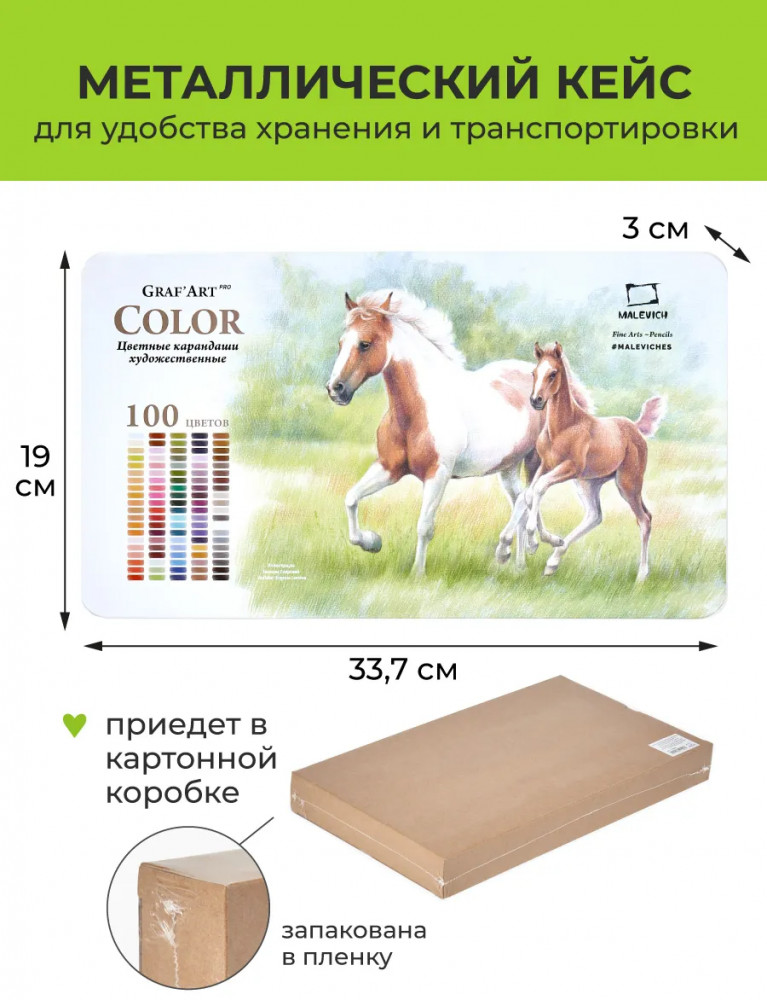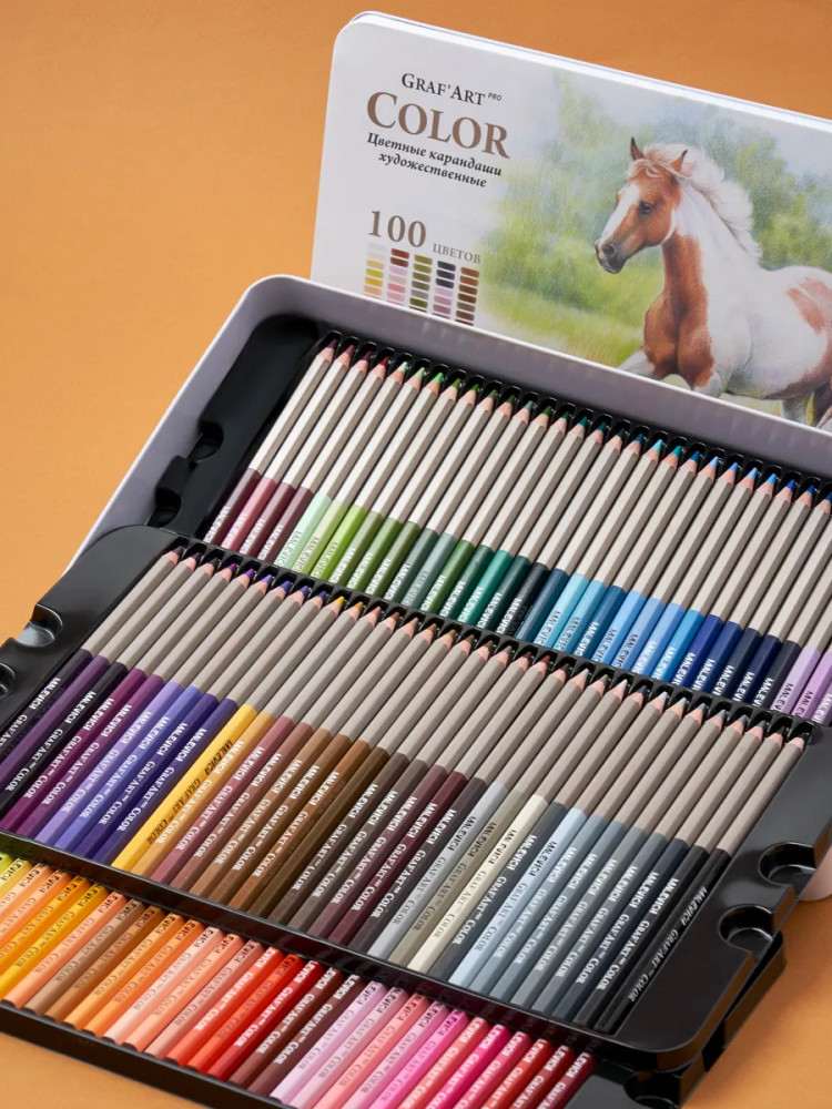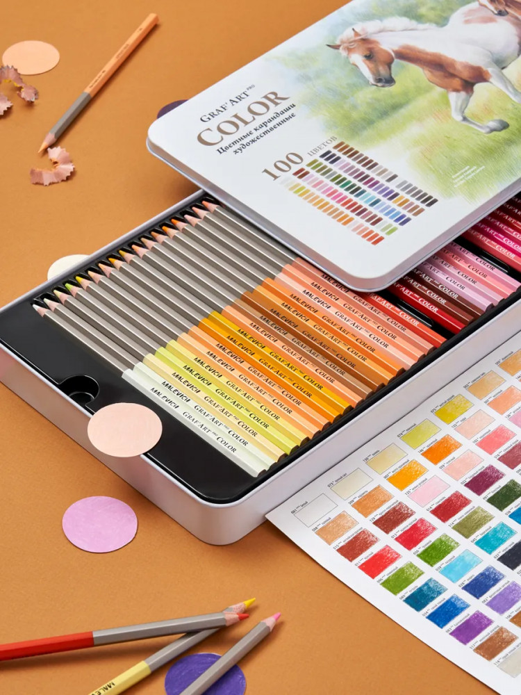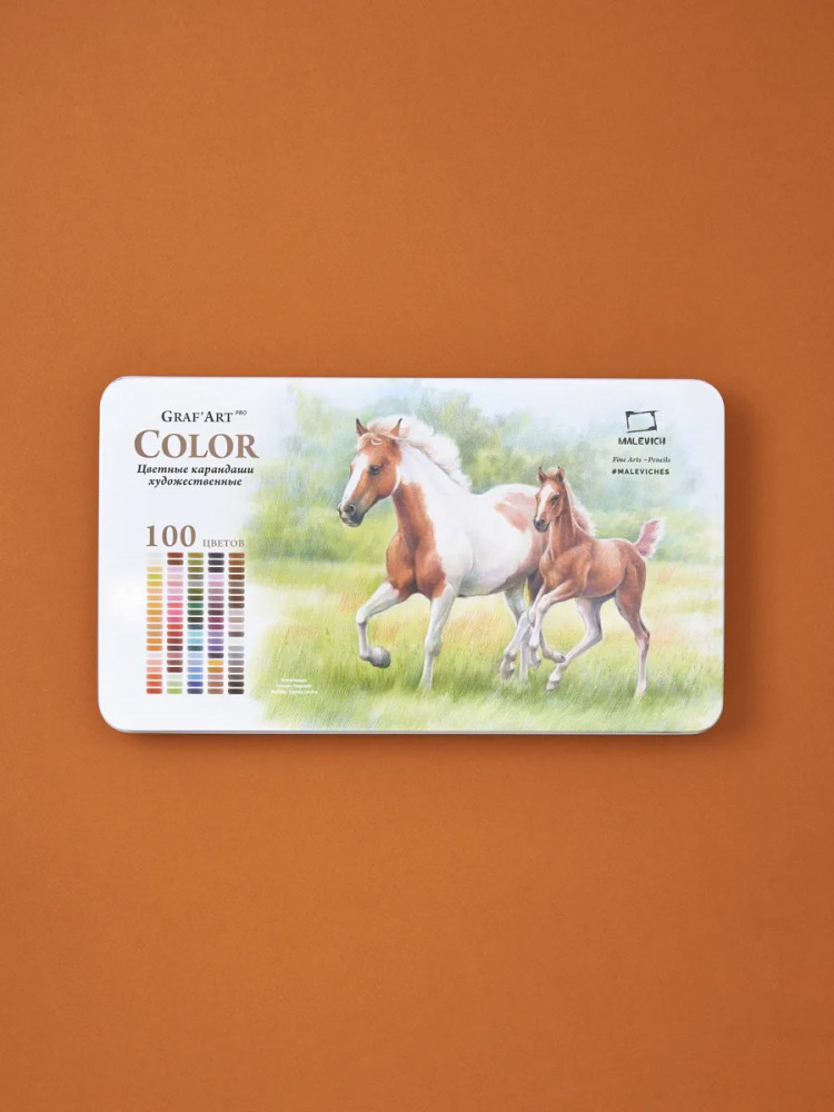 Серия: GrafArt Pro Профессиональные цветные карандаши Малевичъ 100 цв на масляной основе средней твердости. Яркие насыщенные пигменты с высокой светостойкостью порадуют любого художника. Карандаши завораживают своей легкостью и свободой в работе не только на белой бумаге, но также на тонированной и даже черной.