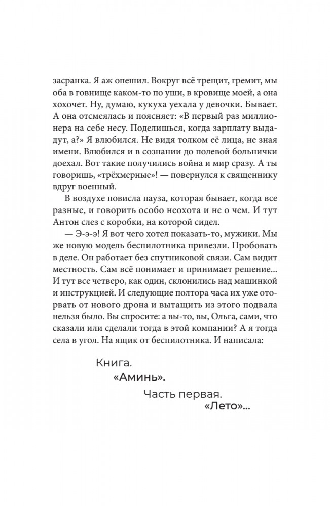 Серия: Вне серии Вместе со своей командой Ольга Анатольевна создаёт новый мир, где люди и роботы трудятся вместе. Одновременно как автор книг она описывает всё происходящее с человечеством сегодня в захватывающих правдивых историях. Первые три романа «Этюды Черни», «Раша», «Си-Пи» уже стали бестселлерами в России и шагнули к читателям в Израиле, США, Франции, Германии. Новый роман «Аминь» — острая правда, квинтэссенция нашего времени, человеческая история на грани жизни и смерти каждого участника и планеты Земля в целом. Цена поступка, цена компромисса. |