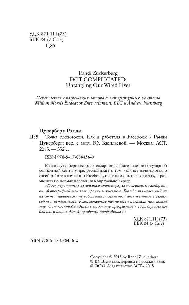 В данный момент этот товар отсутствует в продаже. Возможно, у нас найдется аналогичный или похожий товар здесь. Рэнди Цукерберг, сестра легендарного создателя самой популярной социальной сети в мире, рассказывает о том, «как все начиналось», о своей работе в компании Facebook, о личном опыте в соцсетях и размышляет о нормах поведения в виртуальной среде.