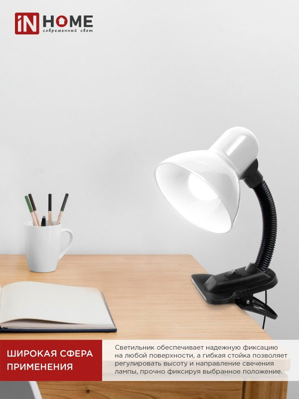 InHome Светильник настольный на прищепкеВ данный момент этот товар отсутствует в продаже. Возможно, у нас найдется аналогичный или похожий товар здесь. Настольный светильник СНП 11 c прищепкой из ABS пластика обеспечивает надежную фиксацию на любой поверхности, а гибкая стойка позволяет регулировать высоту и направление свечения лампы, прочно фиксируя выбранное положение. Надёжный патрон обеспечивает плотный контакт с цоколем лампы, что исключает возможность окисления. |