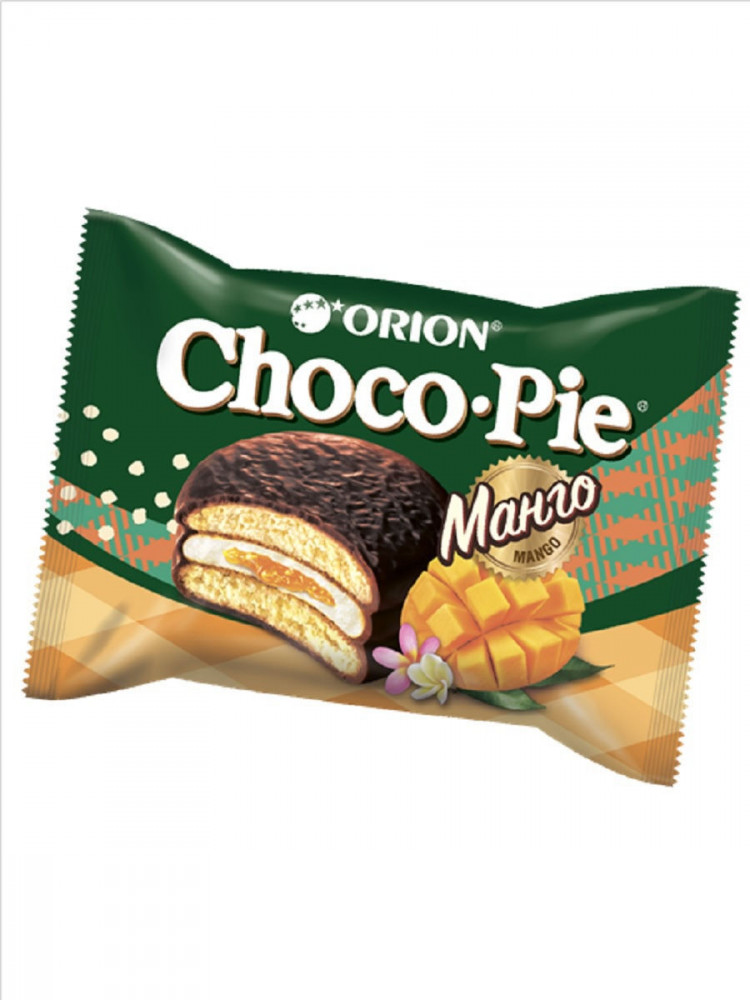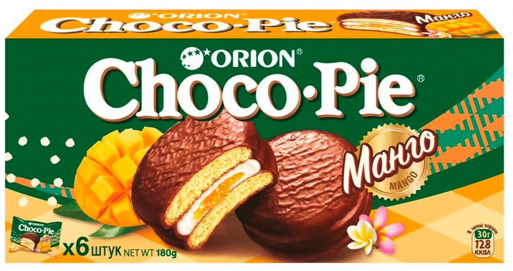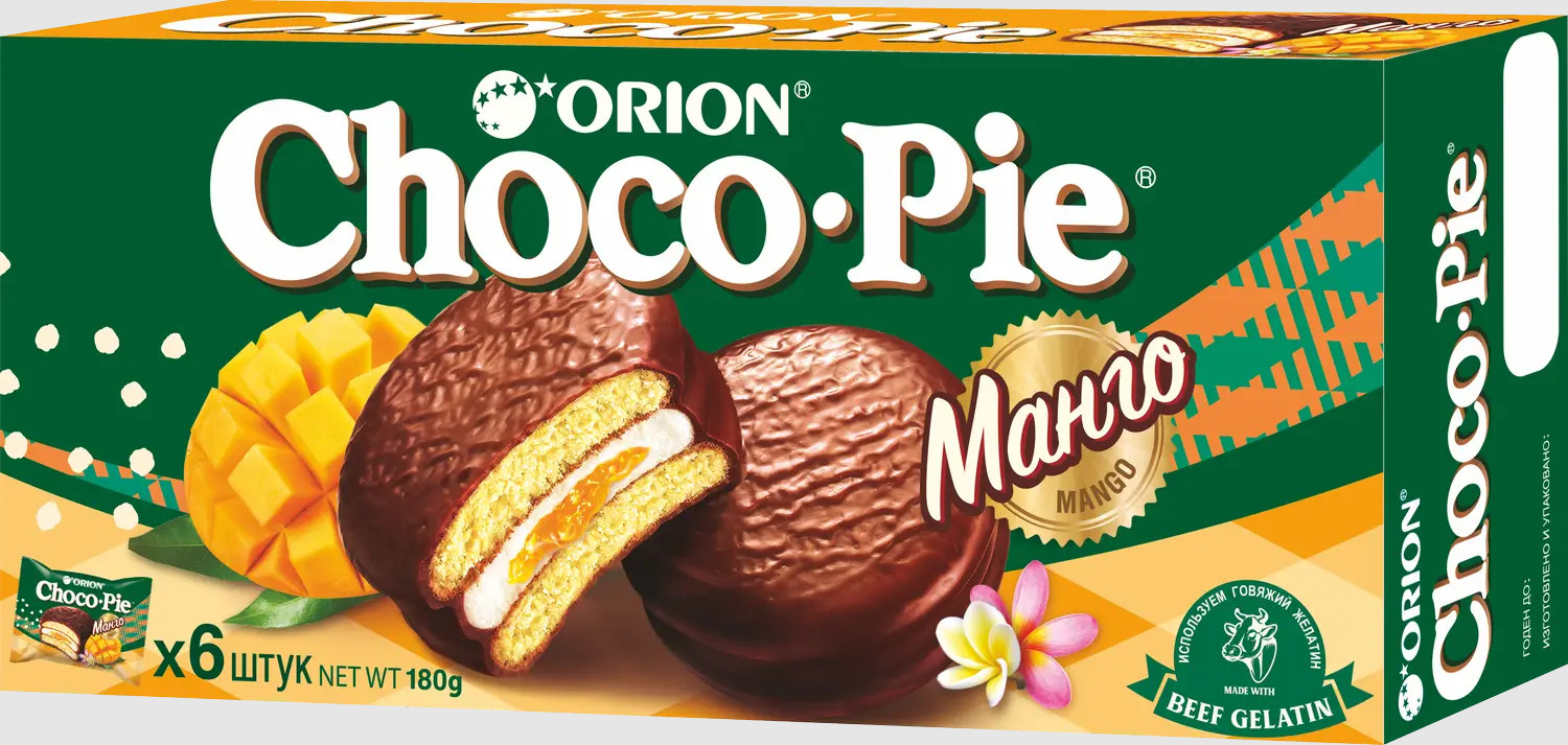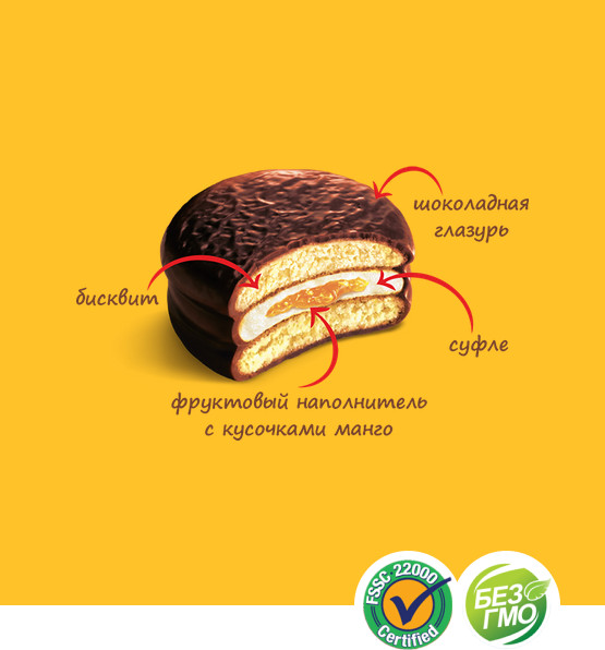 Мука пшеничная общего назначения тип М 55-23, сахар, вода питьевая, патока, жир кондитерский (рафинированные дезодорированные растительные масла (пальмовое, подсолнечное, соевое), эмульгатор (лецитин соевый), антиокислители (Е319, лимонная кислота)), фруктовый наполнитель «Манго» (сахар, манго, глюкозный сироп, глюкоза, вода питьевая, загустители (пектины, ксантановая камедь), регуляторы кислотности (лимонная кислота, цитрат натрия 3-замещенный, цитрат кальция 3-замещенный), антиокислитель (аскорбиновая кислота), краситель (лютеин), консервант (сорбат калия), эмульгатор (Е475)), жир специального назначения (рафинированные дезодорированные растительные масла (пальмовое, пальмоядровое, ши), эмульгаторы (лецитин соевый, сорбитан тристеарат)), молоко сухое цельное, яичные продукты, какао-порошок, лактоза, влагоудерживающие агенты (сорбитовый сироп, глицерин), разрыхлители (гидрокарбонат аммония, гидрокарбонат натрия, ортофосфат кальция 1-замещенный), глюкоза, желатин пищевой, соль, какао тертое, ароматизаторы, молочный белок, загуститель (ксантановая камедь), эмульгатор (лецитин соевый).