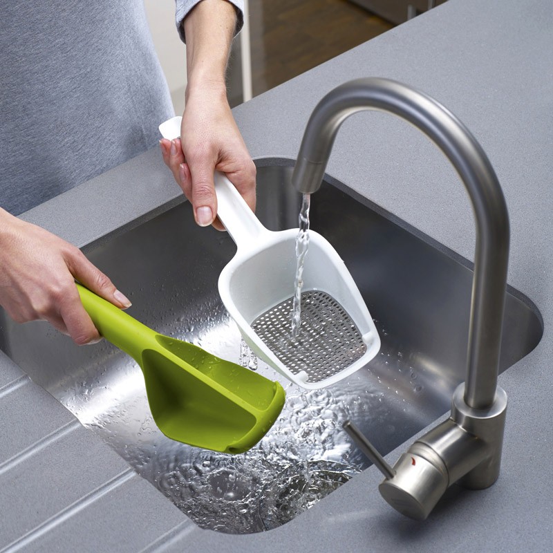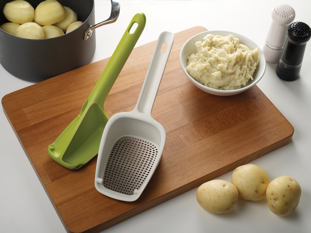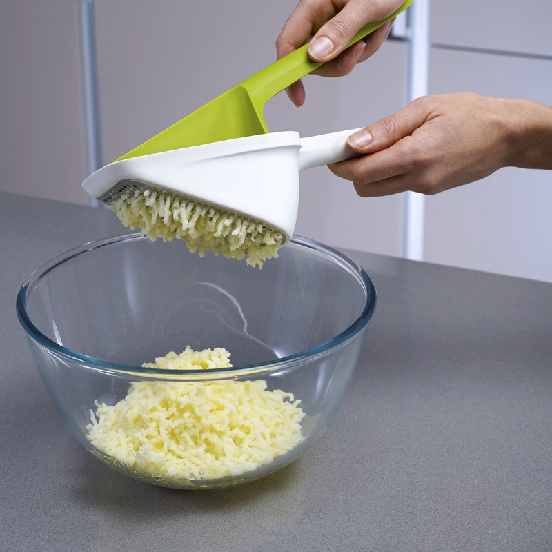 Пресс для пюре «Scoop Ricer» от Joseph Joseph – очень полезное приспособление, позволяющее быстро и без чрезмерных усилий получить однородное пюре, избавив от малейших возможных комочков. В отличие от иных пресс-толкучек, «Scoop Ricer» разрешает черпать вареный картофель непосредственно с горячей кастрюли. Все, что необходимо – снять верхнюю часть прибора и набрать картофель нижней лопаткой, затем соединить их вместе и сдавить.