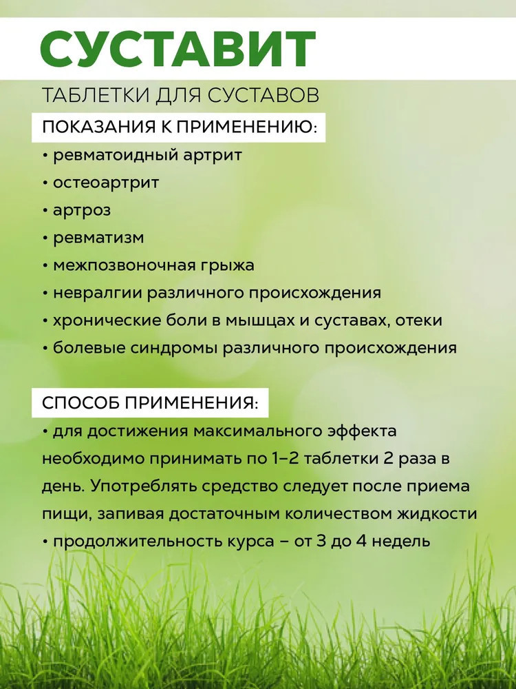 Таблетки для суставов Суставит — эффективный препарат для лечения болезней костно-мышечной системы, избавления от боли в мышцах и суставах. Суставит не просто снимает боль и скрывает симптомы заболевания, но и оказывают мощное противовоспалительное действие, устраняет отечность и воспаление при различных заболеваниях позвоночника и суставов, способствует укреплению суставов, мышц и костей. Благодаря своему уникальному составу их экстрактов растительного происхождения, зеленые таблетки для суставов купируют боль в суставах и позвоночнике, подавляют воспалительный процесс , устраняют онемение и отеки позвоночника и суставов.Натуральность использованных для изготовления препарата компонентов делает его практически безопасным и доступным для лечения пациентов среднего и старшего возраста.