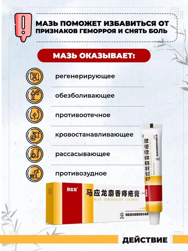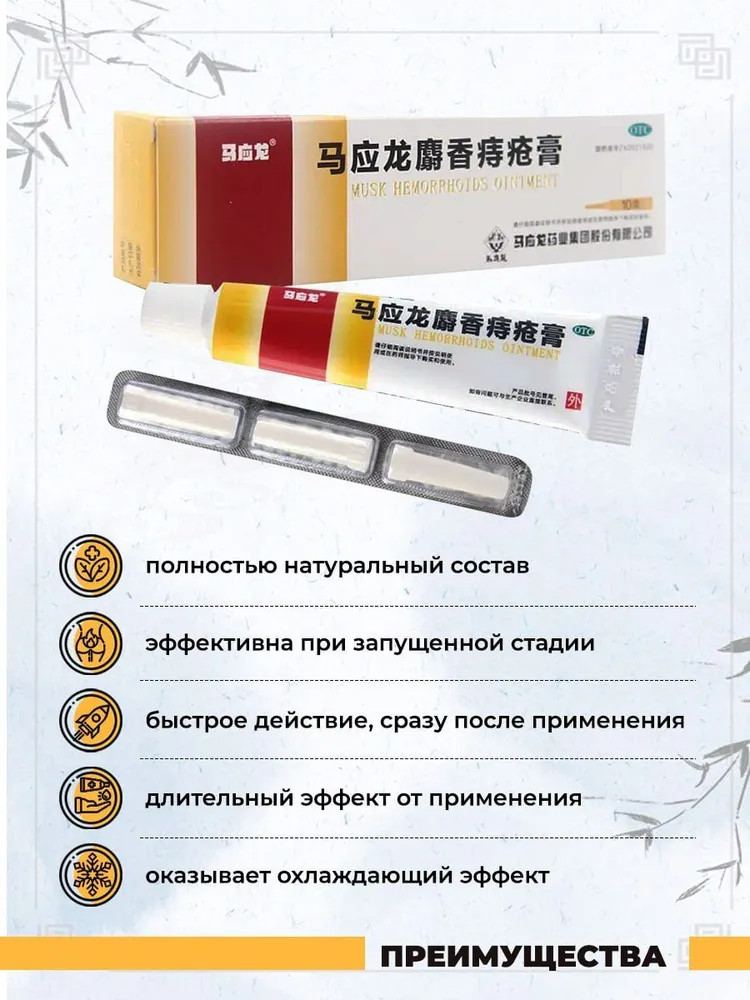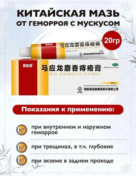 Китайская мазь с мускусом от геморроя почти не имеет противопоказаний, поможет быстро справиться с недугом — устранит боль, снизит ощущение жжение и неприятный зуд, а благодаря мощному противоотечному эффекту поможет убрать узлы геморроя в кратчайшие сроки.