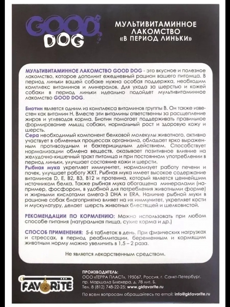 Лакомство мультивитаминное для собак Good dog в период линьки — это вкусное и полезное лакомство, которое дополнит ежедневный рацион вашего питомца. С помощью лакомства вы можете не только баловать питомца, но и заботиться о его здоровье, ведь в состав лакомства входят питательные и полезные вещества, стимулирующие работу всех систем организма.