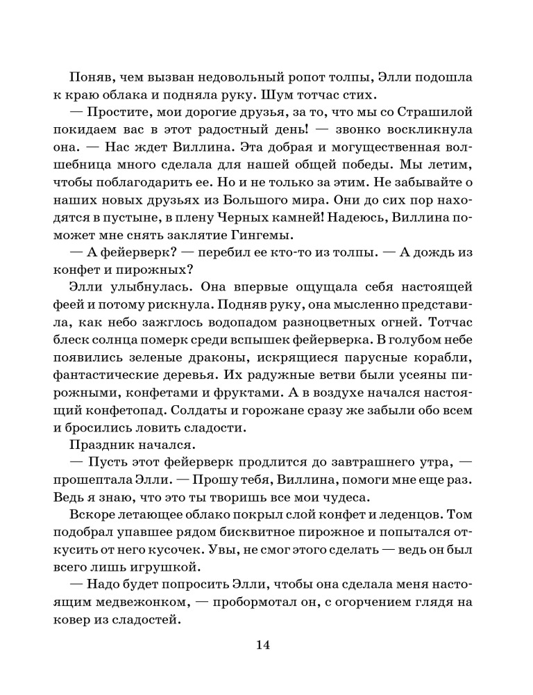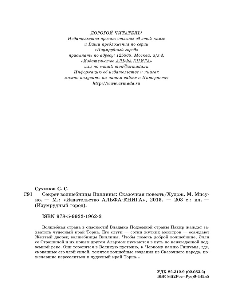 Секрет волшебницы ВиллинВ данный момент этот товар отсутствует в продаже. Возможно, у нас найдется аналогичный или похожий товар здесь. Серия: Изумрудный город Волшебная страна в опасности! Владыка Подземной страны Пакир жаждет захватить чудесный край Торна. Его слуги — сотни жутких монстров — осаждают Желтый дворец волшебницы Виллины. Чтобы помочь доброй волшебнице, Элли со Страшилой и их новым другом Алармом пускаются в путьпо неизведанной подземной реке. Они торопятся в Великую пустыню, к Черному камню Гингемы, где, скованные его злой силой, томятся волшебные создания из Сказочного народа, пожелавшие переселиться в чудесный край Торна… |