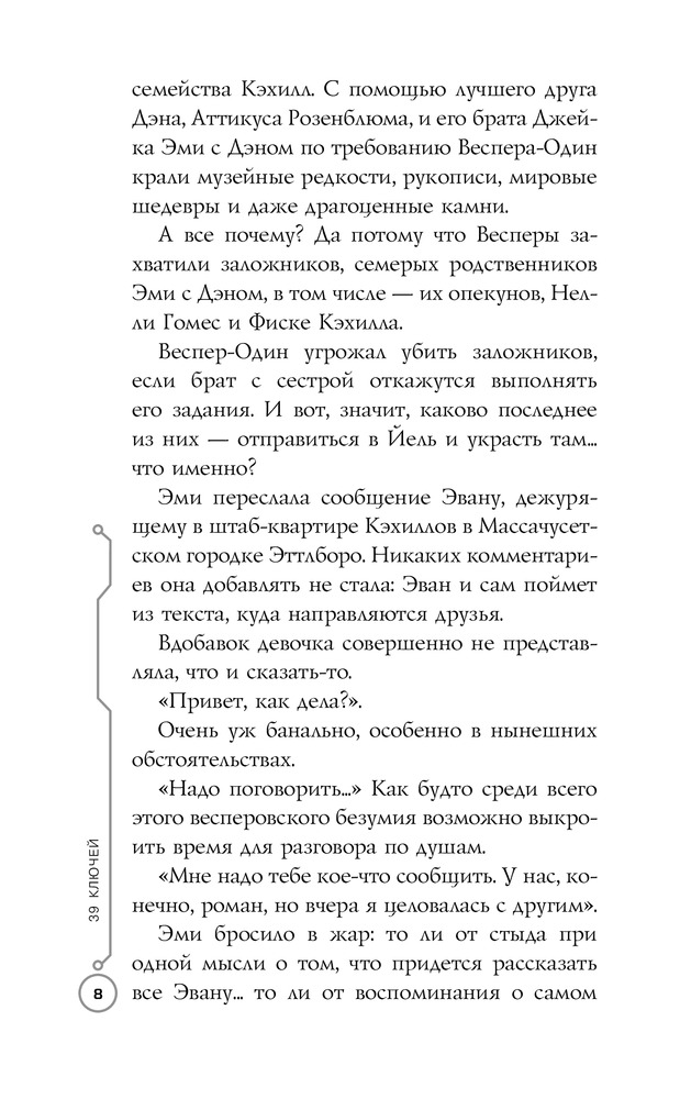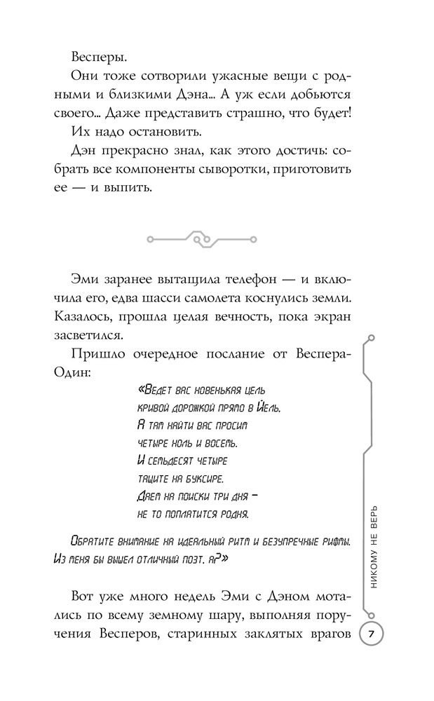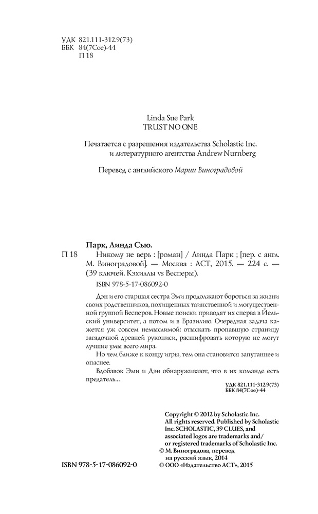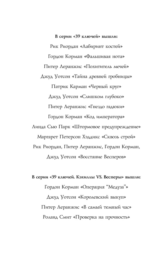 В данный момент этот товар отсутствует в продаже. Возможно, у нас найдется аналогичный или похожий товар здесь. Серия: 39 Ключей Дэн и его старшая сестра Эми продолжают бороться за жизни своих родственников, похищенных таинственной и могущественной группой Весперов. Новые поиски приводят их сперва в Йельский университет, а потом и в Бразилию. Очередная задача кажется уж совсем немыслимой: отыскать пропавшую страницу загадочной древней рукописи, расшифровать которую не могут лучшие умы всего мира.