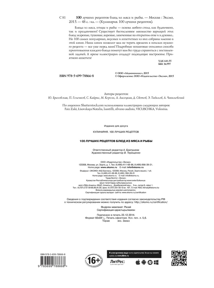 100 лучших рецептов блюд из мяса и рыбыВ данный момент этот товар отсутствует в продаже. Возможно, у нас найдется аналогичный или похожий товар здесь. Серия: Кулинария. 100 лучших рецептов Блюда из мяса, птицы и рыбы - основа любого стола, как будничного, так и праздничного! Существует бесчисленное множество вариаций этих блюд: жареные, тушеные, вареные, запеченные на открытом огне и в духовке. Но 100 самых популярных, вкусных и аппетитных из них собраны именно в этой книге. Наша книга позволит вам не терять времени в поисках нужного рецепта - все уже перед вами! Подробные пошаговые описания способа приготовления каждого блюда помогут вам без труда справиться с поставленной задачей. А яркие иллюстрации создадут подходящее настроение. Приятного аппетита! |