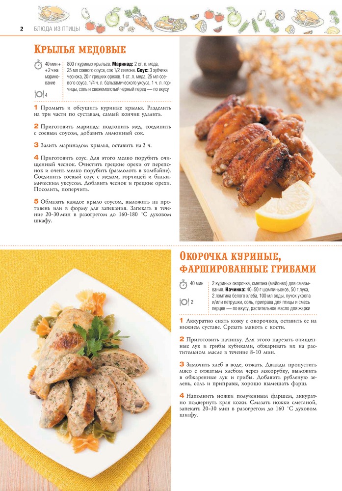 Книга по размерам большая, красиво оформлена, прекрасные фото блюд. Содержание: блюда из птицы,свинины,говядины,рыбы и морепродуктов, и субпродуктов. Рецепты хорошие, мне кажется больше праздничные,оригинальные не избитые,желание приготовить есть! Уже приготовила некоторые для встречи друзей- всем понравилось, даже спрашивали как приготовила? Медовые крылышки из книги, хотя их делаю постоянно, но видно эти вкусней. Спасибо, книга удачная!