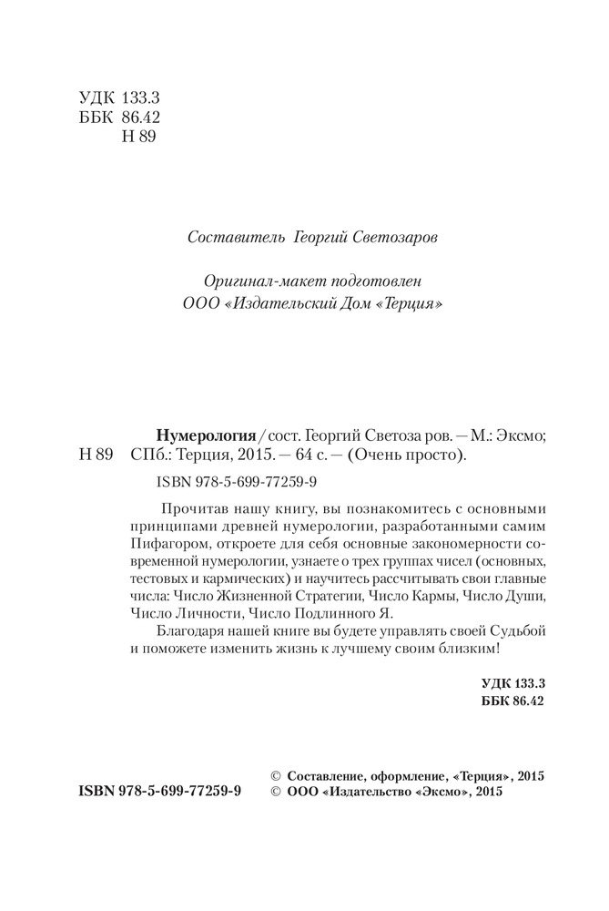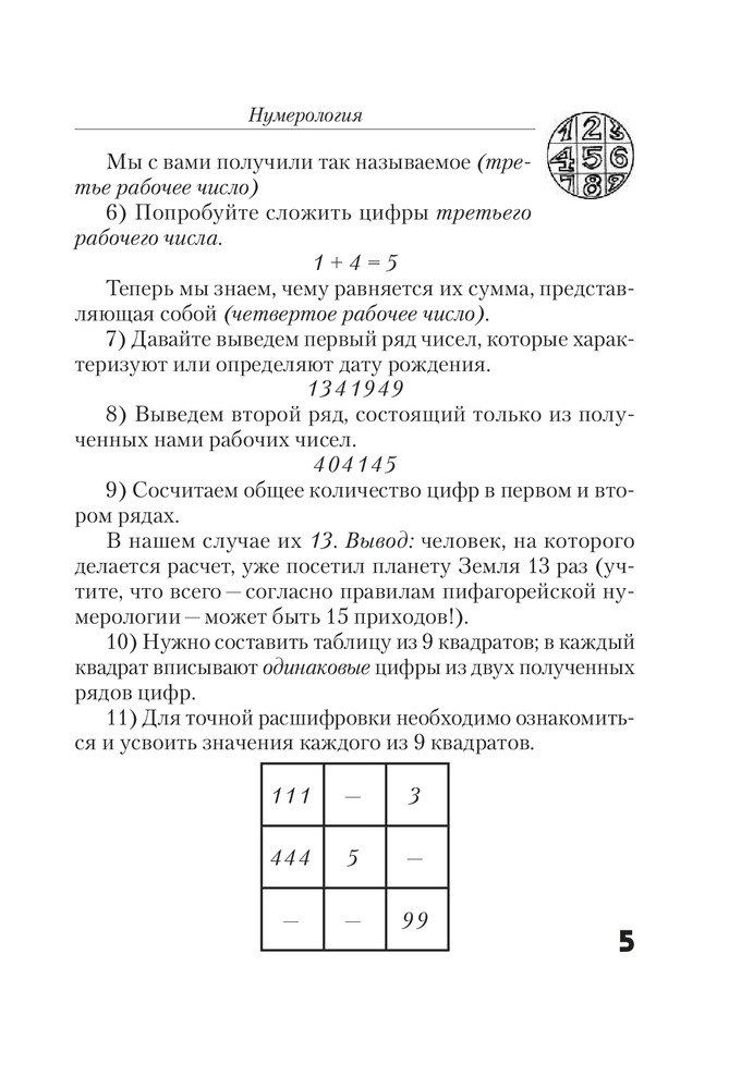 НумерологияВ данный момент этот товар отсутствует в продаже. Возможно, у нас найдется аналогичный или похожий товар здесь. Серия: Очень просто! Прочитав нашу книгу, вы познакомитесь с основными принципами древней нумерологии, разработанными самим Пифагором, откроете для себя основные закономерности современной нумерологии, узнаете о трех группах чисел (основных, тестовых и кармических) и научитесь рассчитывать свои главные числа: Число Жизненной Стратегии, Число Кармы, Число Души, Число Личности, Число Подлинного Я. Благодаря нашей книге вы будете управлять своей Судьбой и поможете изменить жизнь к лучшему своим близким! |