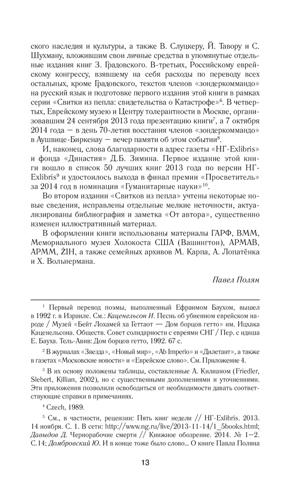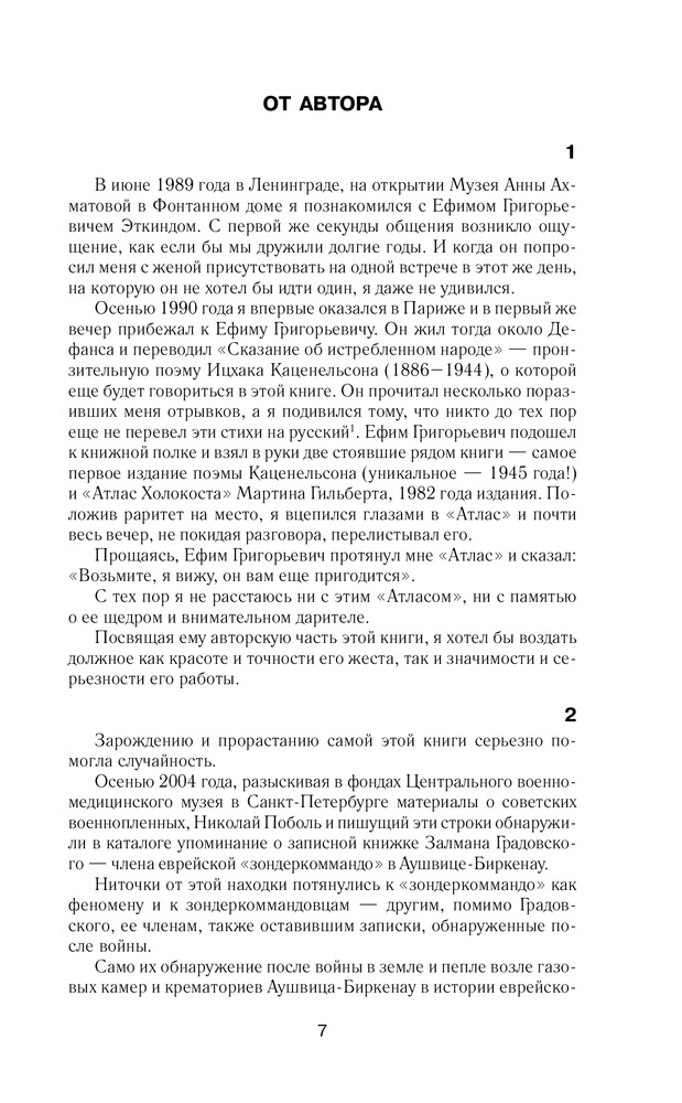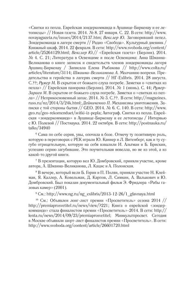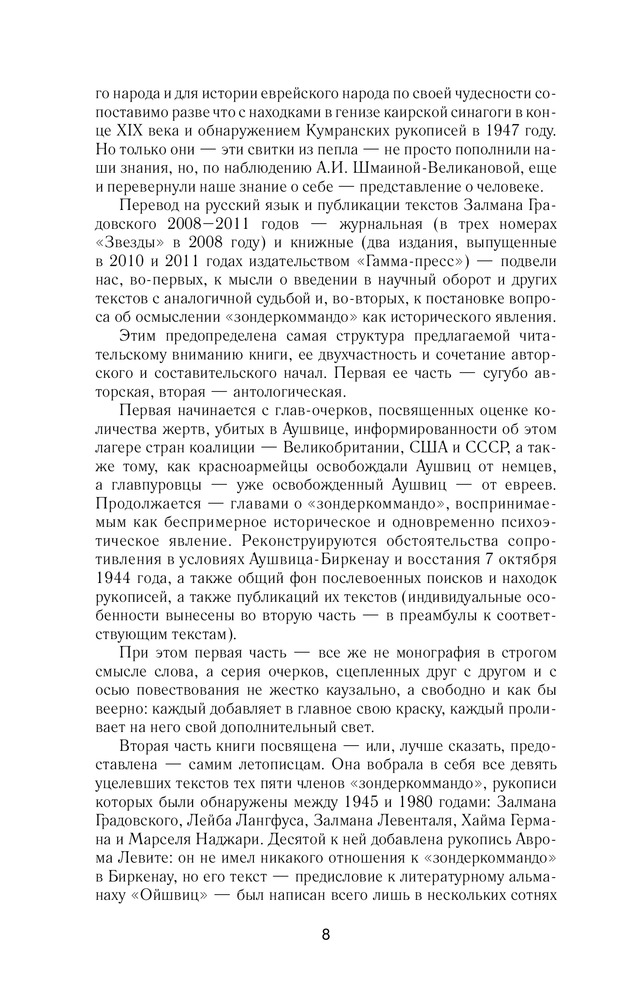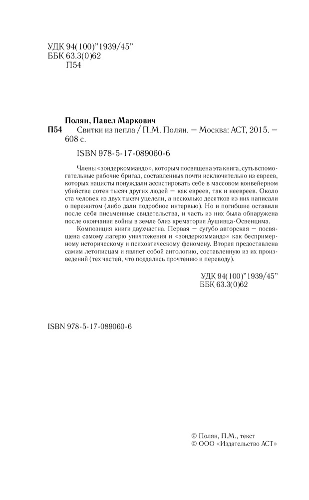Свитки из пеплаВ данный момент этот товар отсутствует в продаже. Возможно, у нас найдется аналогичный или похожий товар здесь. Члены «зондеркоммандо», которым посвящена эта книга, суть вспомогательные рабочие бригад, составленных почти исключительно из евреев, которых нацисты понуждали ассистировать себе в массовом конвейерном убийстве сотен тысяч других людей – как евреев, так и неевреев. Около ста человек из двух тысяч уцелели, а несколько десятков из них написали о пережитом (либо дали подробное интервью). Но и погибшие оставили после себя письменные свидетельства, и часть из них была обнаружена после окончания войны в земле близ крематория Аушивца-Освенцима. Эти свитки – бесспорно, центральные документы Холокоста, до недавнего времени совершенно неизвестные в России, - впервые собраны в этой книге. Композиция книги двухчастна. Первая – сугубо авторская – посвящена самому лагерю уничтожения и «зондеркоммандо» как беспримерному историческому и психоэтическому феномену. Вторая предоставлена самим летописцам и являет собой антологию, составленную из их произведений (тех частей, что поддались прочтению и переводу).  |