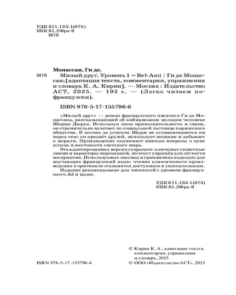 💳 Оплатить за товар можно при получении 🇰🇿 Есть бесплатная доставка по Казахстану 🎁 Копите бонусы с каждой покупки Серия: Легко читаем по-французски «Милый друг» — роман французского писателя Ги де Мопассана, рассказывающий об амбициозном молодом человеке Жорже Дюруа. Используя свою привлекательность и связи, он стремительно взлетает по социальной лестнице парижского общества. В погоне за успехом Жорж не останавливается ни перед чем: он предаёт друзей, использует женщин и забывает о морали. Произведение поднимает важные вопросы о цене успеха и жестокости светского мира. Эта адаптированная версия сохраняет ключевые сюжетные линии и характеры персонажей, но текст упрощён для лёгкости восприятия. Используемые лексика и грамматика подходят для изучающих французский язык: чтение классического произведения в оригинале становится доступным и увлекательным. Издание рекомендовано для читателей с уровнем французского A2 и выше. |