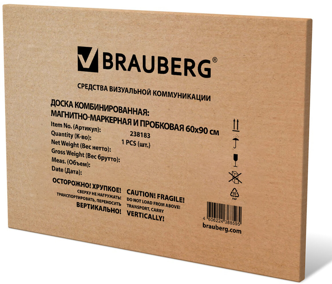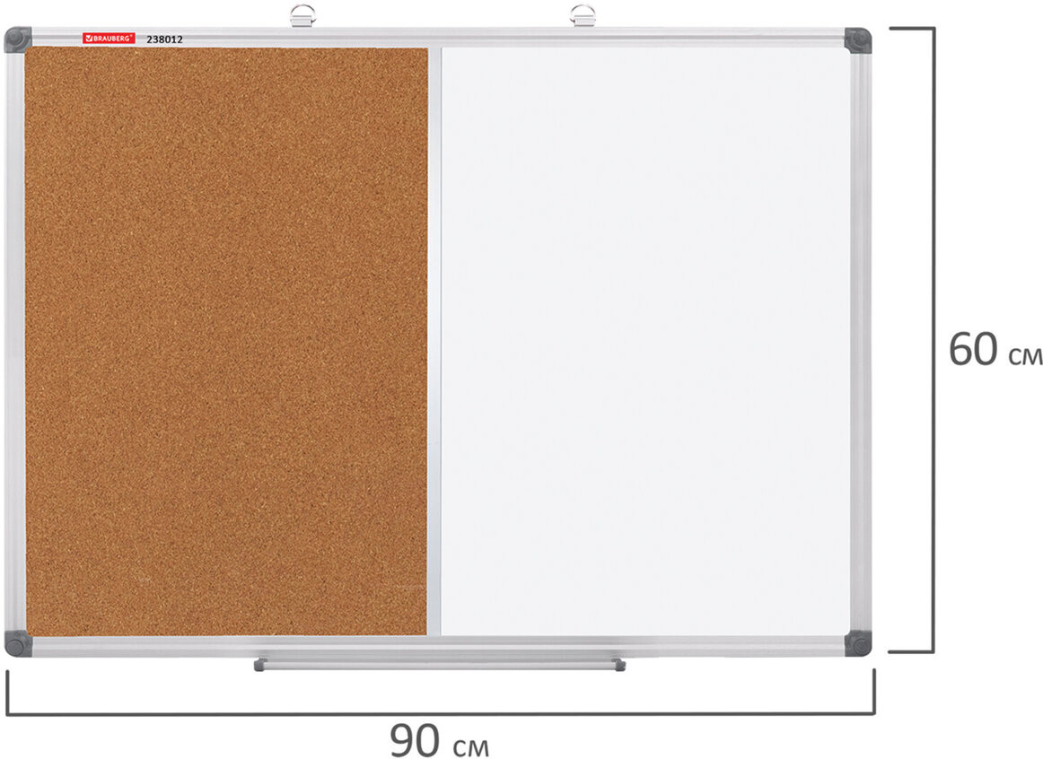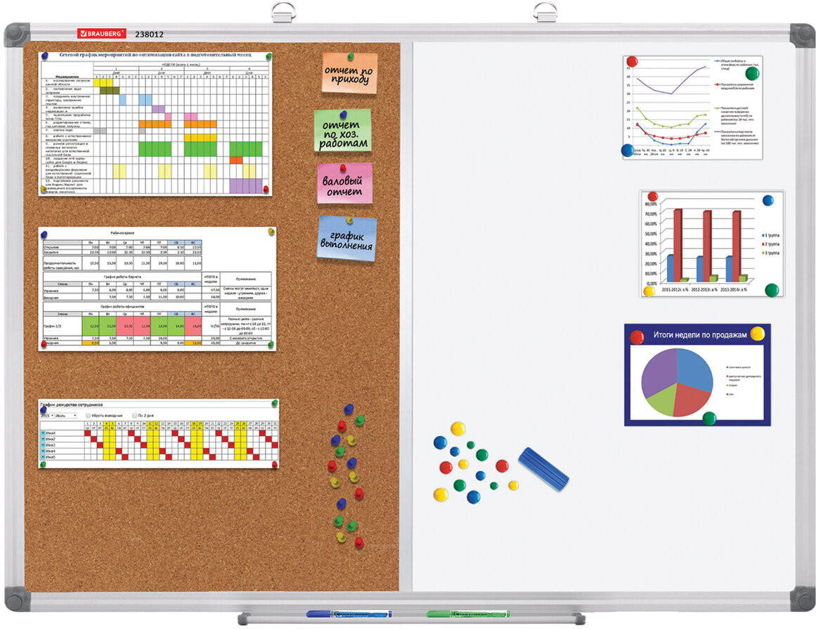 Серия: Extra Комбинированная доска Brauberg Extra — магнитно-маркерная и пробковая доски в единой рамке для экономии пространства. Идеально подходит для использования в любых организациях. Белая поверхность доски с лаковым покрытием соединена с коричневой поверхностью из натуральной пробки при помощи металлической планки, что обеспечивает надежность и долгий срок службы. Магнитная поверхность предназначена для письма специальными маркерами для белой доски и размещения информации при помощи магнитов, пробковая поверхность — для крепления бумажных материалов, заметок при помощи кнопок и офисных булавок. Имеет улучшенную алюминиевую рамку и укрепленные защитные пластиковые уголки. Размер доски — 60×90 см. Элементы крепления к стене и полка для принадлежностей входят в комплект. |
