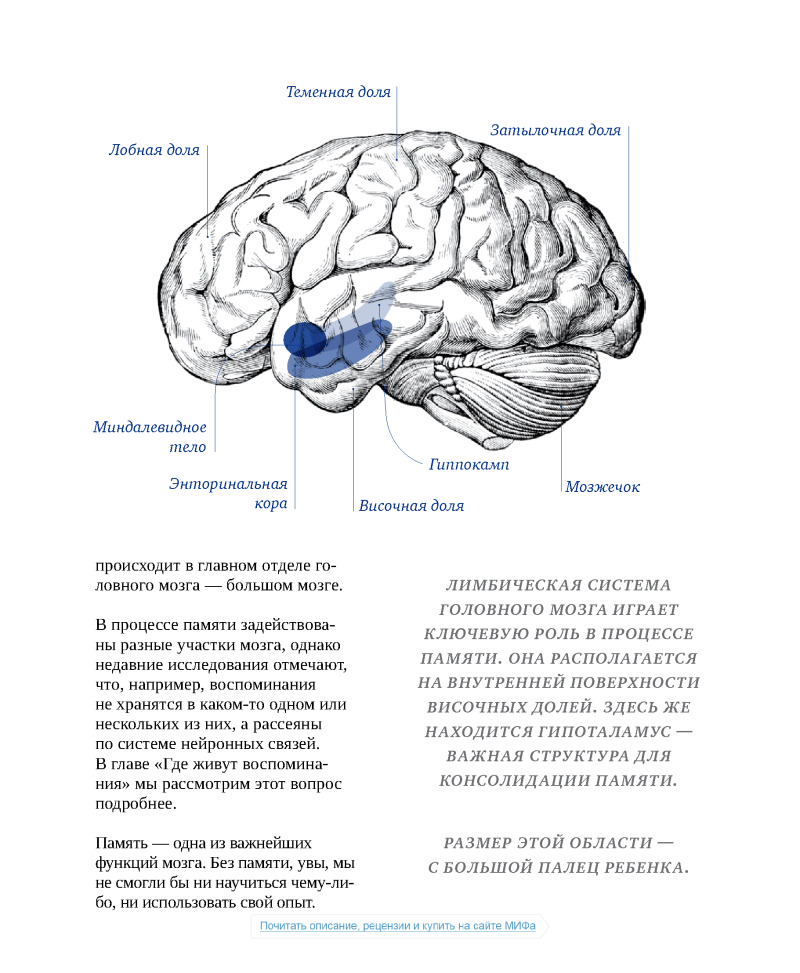 В процессе памяти участвуют различные участки мозга, и нет одного специфического места для хранения запомненной информации. Воспоминание — это паттерн нейронных связей, распределенных по разным нейронным цепочкам и участкам мозга.