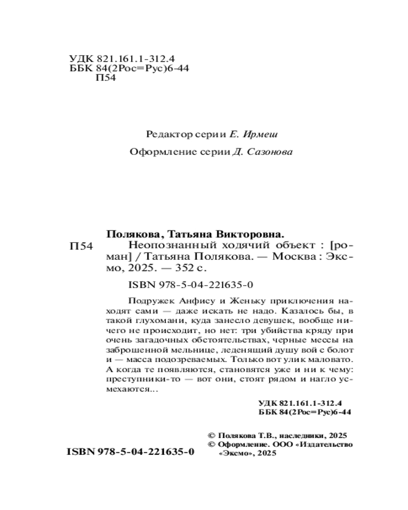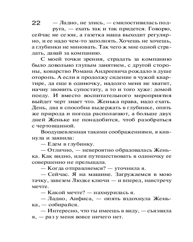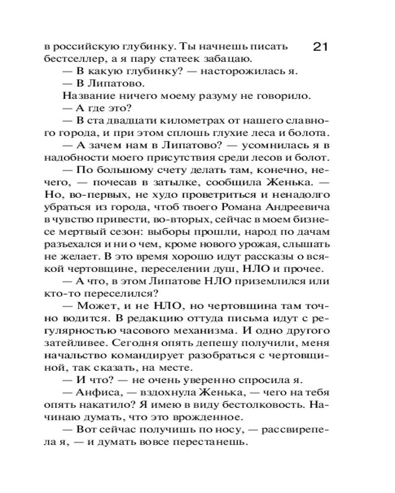 Серия: 50 лучших авантюрных детективов (обложка) Подружек Анфису и Женьку приключения находят сами — даже искать не надо. Казалось бы, в такой глухомани, куда занесло девушек, вообще ничего не происходит, но нет: три убийства кряду при очень загадочных обстоятельствах, черные мессы на заброшенной мельнице, леденящий душу вой с болот и — масса подозреваемых. Только вот улик маловато. А когда те появляются, становятся уже и ни к чему: преступники-то — вот они, стоят рядом и нагло усмехаются... |