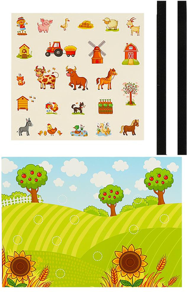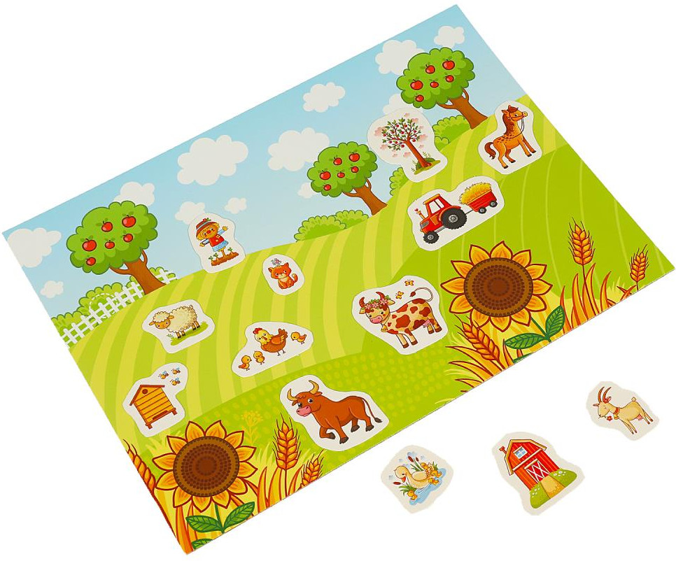 Рассмотрите с ребёнком поле-основу и фигурки персонажей. Пофантазируйте с малышом: попросите его придумать, каких животных можно расположить на поле, а затем предложите ему придумать небольшую историю по собранной картинке.