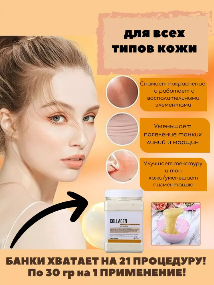 • интенсивное увлажнение и выравнивание микрорельефа — коллаген удерживает влагу, повышает упругость и делает кожу более гладкой;