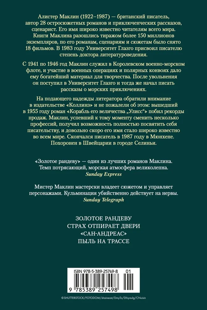 💳 Оплатить за товар можно при получении 🇰🇿 Есть бесплатная доставка по Казахстану 🎁 Копите бонусы с каждой покупки Серия: Мир приключений. Большие книги Сборник открывается романом «Золотое рандеву». На борт роскошного круизного лайнера проникают террористы. Они быстро захватывают заложников, но среди офицеров команды находится человек, который практически в одиночку противостоит преступникам. Неподалеку от Кубы сбит самолет, перевозивший секретный груз («Страх отпирает двери»). Вместе с экипажем погибает семья совладельца авиакомпании. Теперь им движет единственное желание — отомстить тому, кто виновен в катастрофе. |