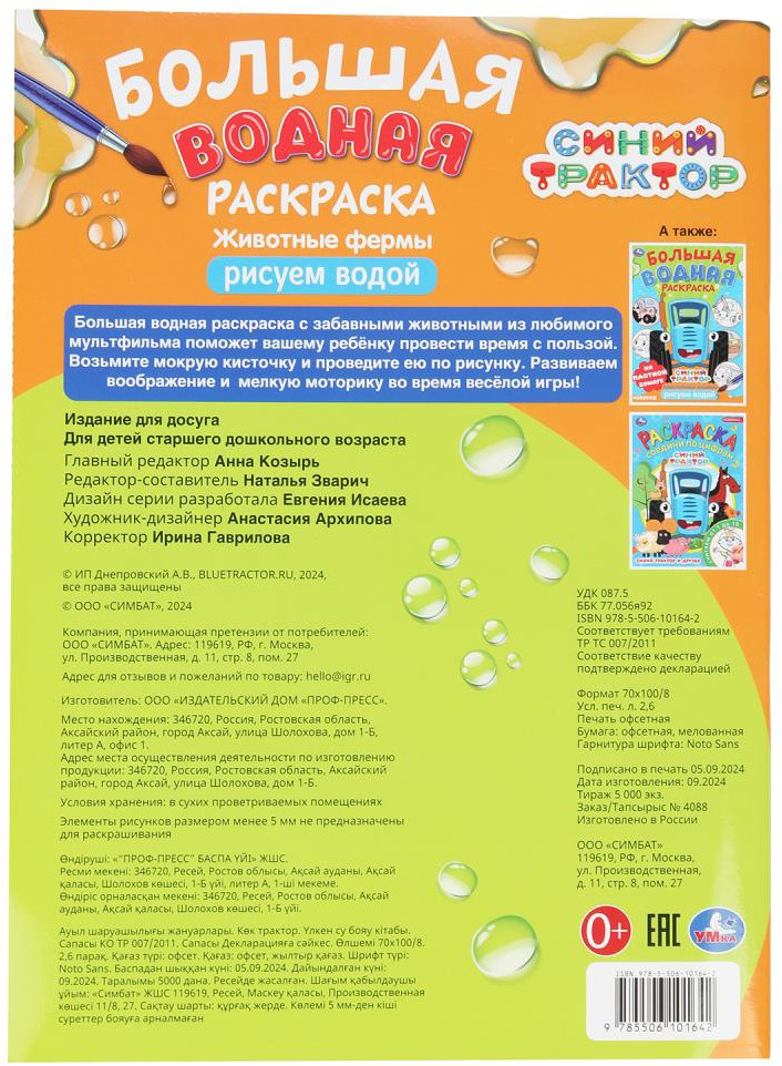 Серия: Синий трактор Большая водная раскраска «Синий Трактор. Животные фермы» из серии «Рисуем водой» ТМ «УМка» обязательно понравится маленькому художнику. Водная раскраска скрасит досуг малыша и поможет раскрыть ему творческий потенциал. Для раскрашивания не понадобятся краски, карандаши или фломастеры - достаточно просто провести по рисунку мокрой кисточкой, чтобы он стал красочным и ярким. Крупные иллюстрации выполнены на плотной бумаге, что сделает процесс раскрашивания более удобным. |