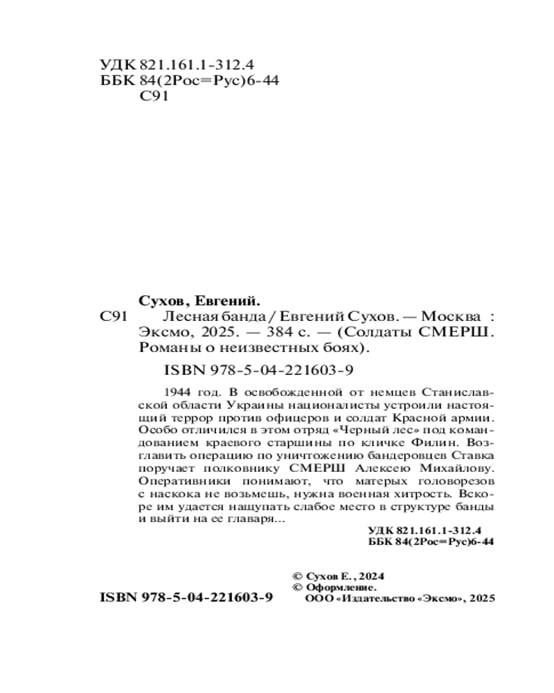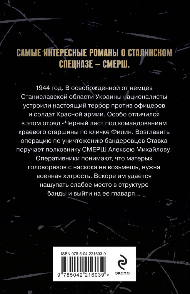 Серия: Солдаты СМЕРШ. Романы о неизвестных боях. Новое оформление (обложка) 1944 год. В освобожденной от немцев Станиславской области Украины националисты устроили настоящий террор против офицеров и солдат Красной армии. Особо отличился в этом отряд «Черный лес» под командованием краевого старшины по кличке Филин. Возглавить операцию по уничтожению бандеровцев Ставка поручает полковнику СМЕРШ Алексею Михайлову. Оперативники понимают, что матерых головорезов с наскока не возьмешь, нужна военная хитрость. Вскоре им удается нащупать слабое место в структуре банды и выйти на ее главаря... |