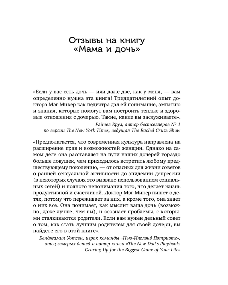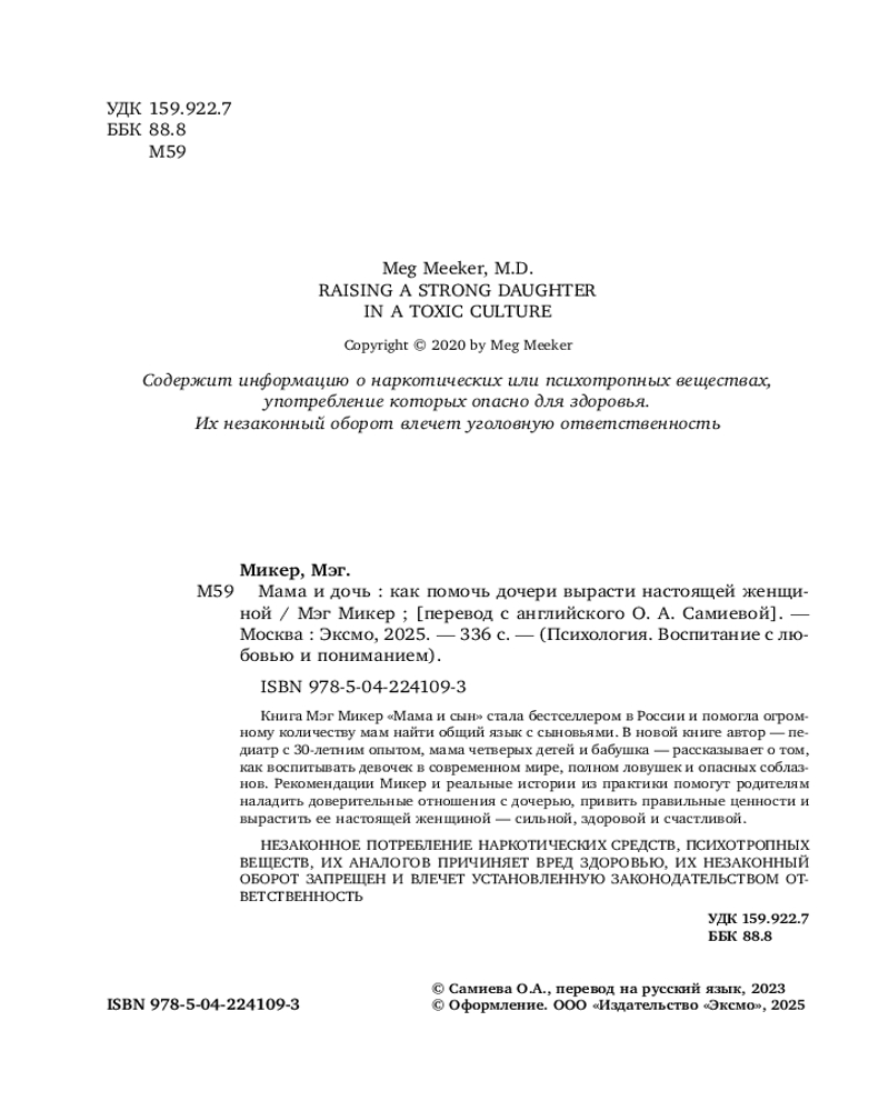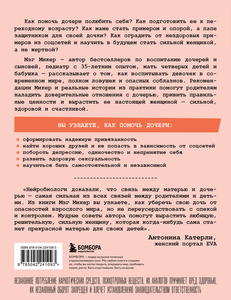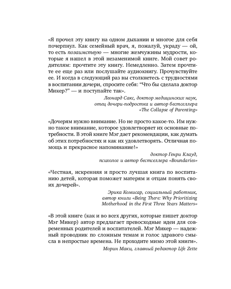 Серия: Психология. Воспитание с любовью и пониманием (обложка) Если у вас дочь, эта книга вам необходима! Как уберечь дочь в современном мире, где много соблазнов и нездоровых примеров? Как стать ей опорой с детства и помочь пережить подростковый возраст, в котором бушуют гормоны и тянет на противоречия? В этой книге Мэг Микер, педиатр с 30-летним опытом, автор бестселлеров, мама и бабушка, рассказывает о том, как уберечь дочь от бед и соблазнов и вырастить ее здоровой и счастливой. Автор предлагает систему воспитания из 11 шагов, которая поможет родителям научиться лучше понимать свою дочь, наладить доверительные отношения и привить ей правильные ценности. |